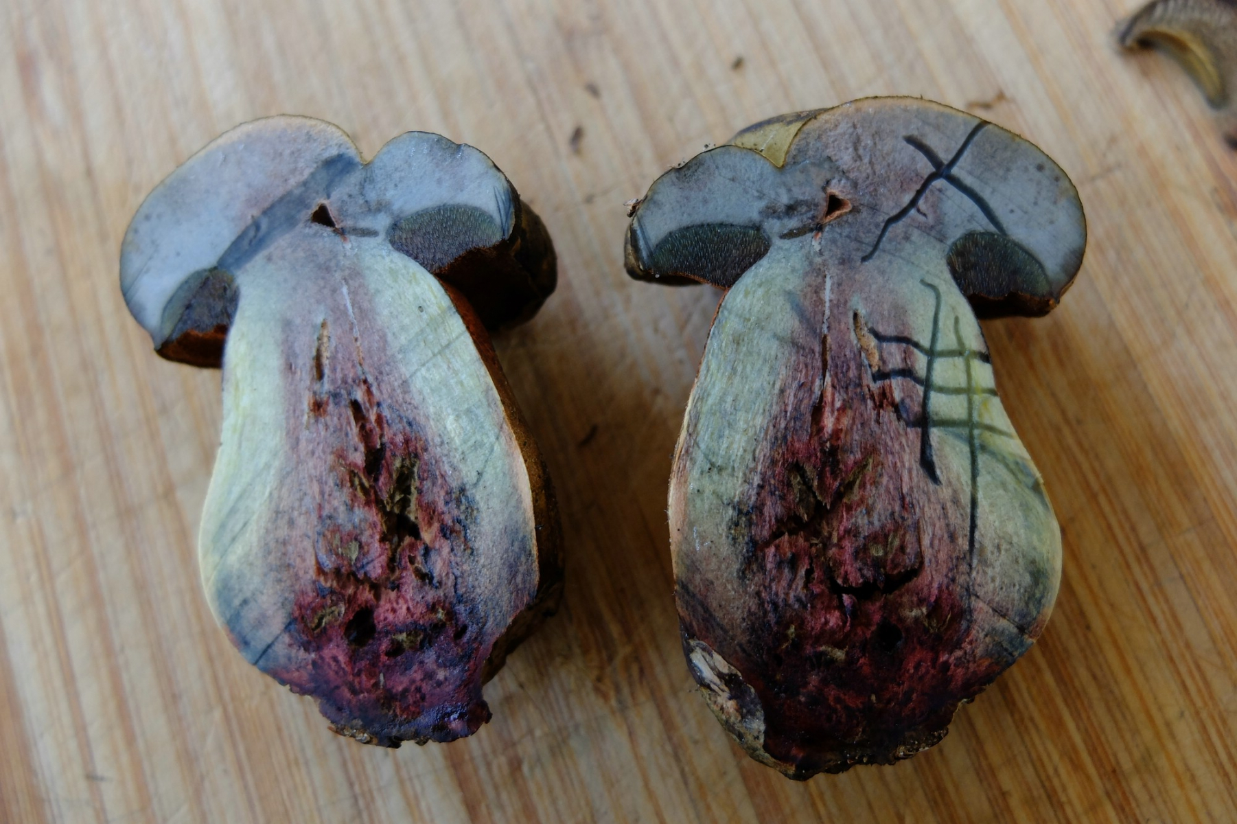 Typisch ist aber ein schlanker Stiel und das sehr stark schwarzblauende Fleisch - und die Sporen haben einen deutlich höheren Quotienten. Weinrot können aber alle Suilellus-Arten sein.