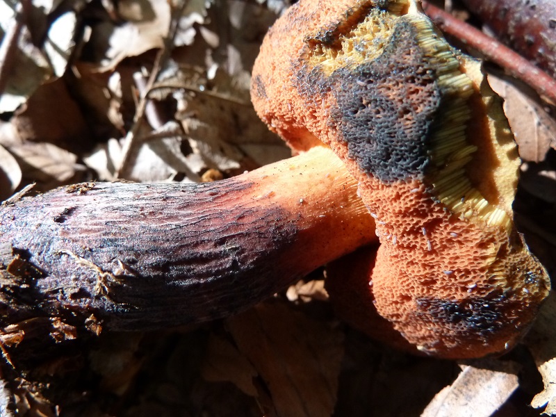 diesen Hexenröhrling mit deutlich roten Hutfarben habe ich auf einem stark zersetzten Buchenast gefunden. Wegen dem Fundort und den Farben dachte ich zuerst an einen purpurfilzigen Holzritterling, bis ich ihn in der Hand hatte. Fundort Buchen-Hainbuchen-Mischwald auf basischem Basalt, ziemlich steiler Nordhang mit viel jungem Buchenunterholz, keine sonnenverwöhnte Lage.