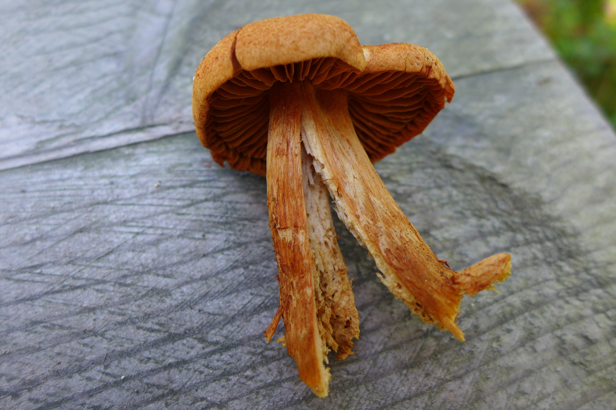 C. orellanus hat keine Velumgürtel, sondern einen eher leuchtend gelbbraunen längsfasrigen Stiel