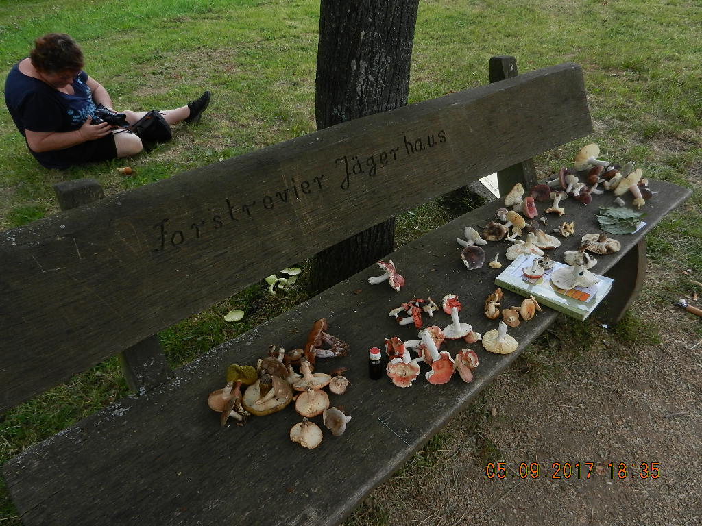 Als wir dann am Treffpunkt ankamen, beschlossen wir, uns zur Fundbesprechung an eine Bank zu begeben. Also Sitzbank. Und dann gings erst richtig los. Erst nahmen wir eine grobe Unterscheidungsauswahl vor. Dann eine Gruppierung. Zwei Täublinge waren recht schnell und leicht bestimmt. Es wurde dann aber schon etwas spezieller. Wir waren immer mehr vertieft in unser "Fachgespräch", dass es natürlich meinem Mann zu langweilig wurde. Der arme Wicht. Er ging dann lieber noch mal in den Wald. Ein kleiner Ausflug sozusagen. Ich bekam Sachen zu Gesicht, einfach nur fantastisch.