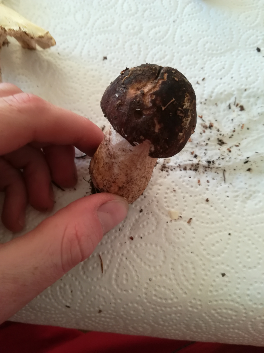 aus meiner Sicht ist das ein gewöhnlicher Birkenpilz (Leccinum scabrum). Man erkennt ihn daran, dass er nicht grau oder violett verfärbt und auch nirgends blaue Stellen hat. Nur die Röhrenmündungen werden auf Druck braun. Darüber, ob der Schwärzliche Birkenpilz überhaupt eine eigene Art ist, streiten die Fachleute, denn außer dass er dunkler gefärbt ist, hat er keinerlei abweichende Merkmale zum gewöhnlichen Birkenpilz.