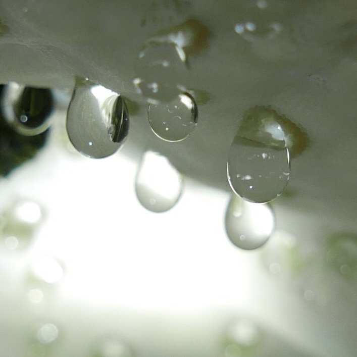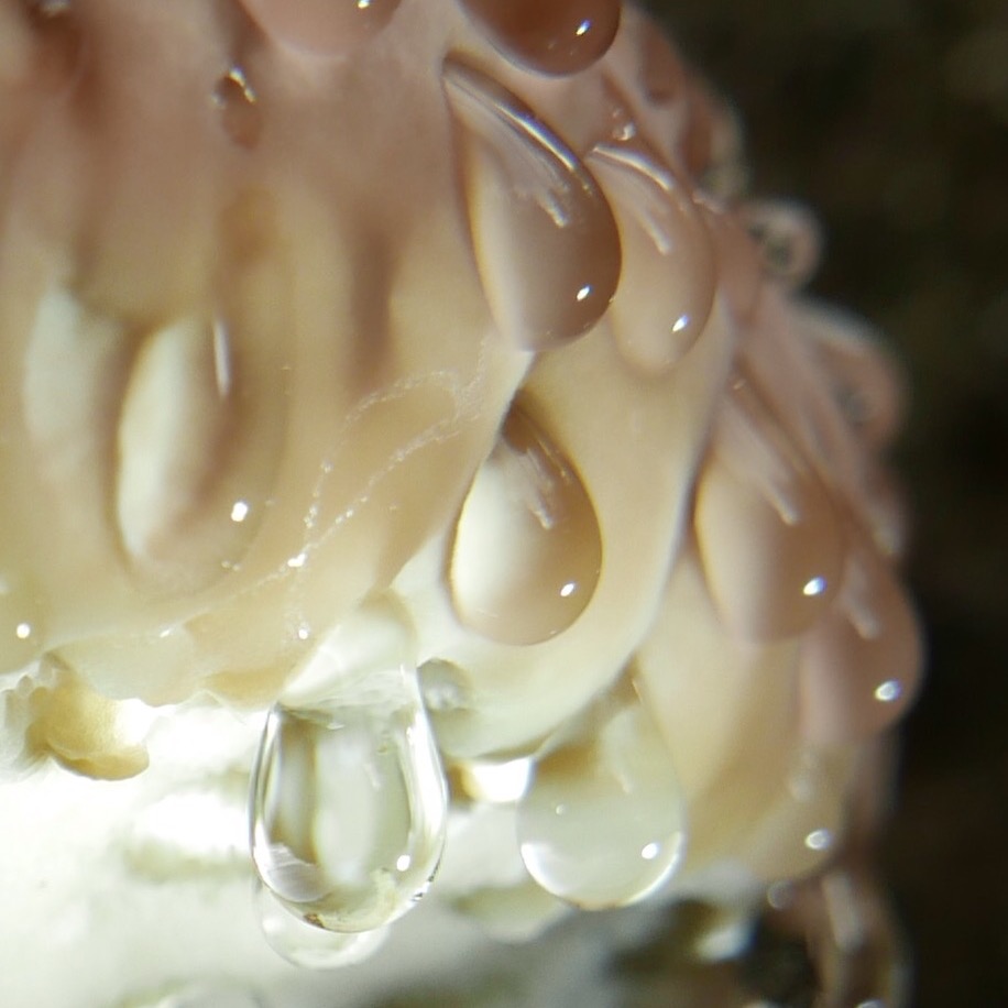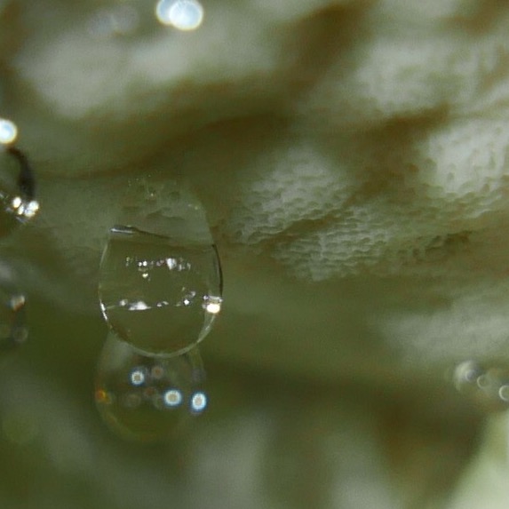 Er funkelte mich schon vom Weg aus an. Ich liebe diese Guttationstropfen, sie sehen immer aus, als wären es kleine Juwelen, nur aus Licht und Wasser.