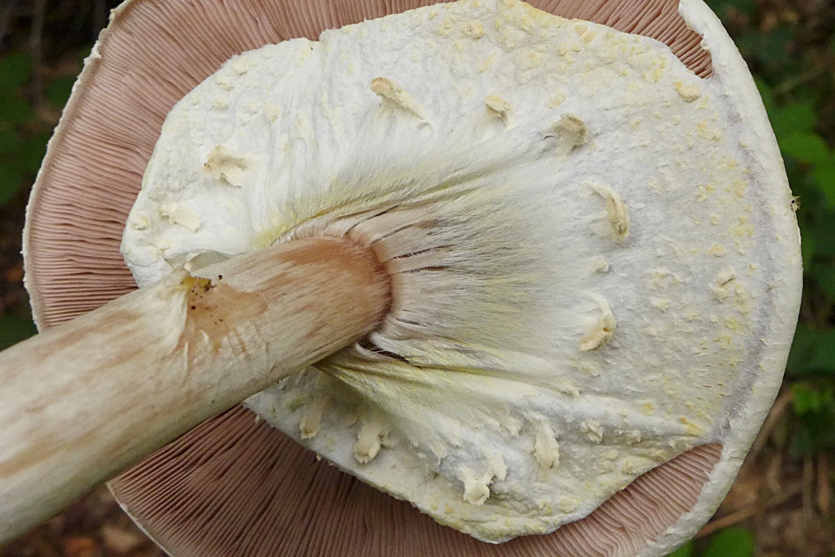 Auffällig war diese faserige Hutstruktur, rosalich unterlegt (soll das so? oder ist so variabel ?), sehr rosa Lamellen, sehr flüchtiger Ring (geht sofort in Fetzen), leicht überhängender Hutrand, sehr gerader Stiel ohne Verdickung.