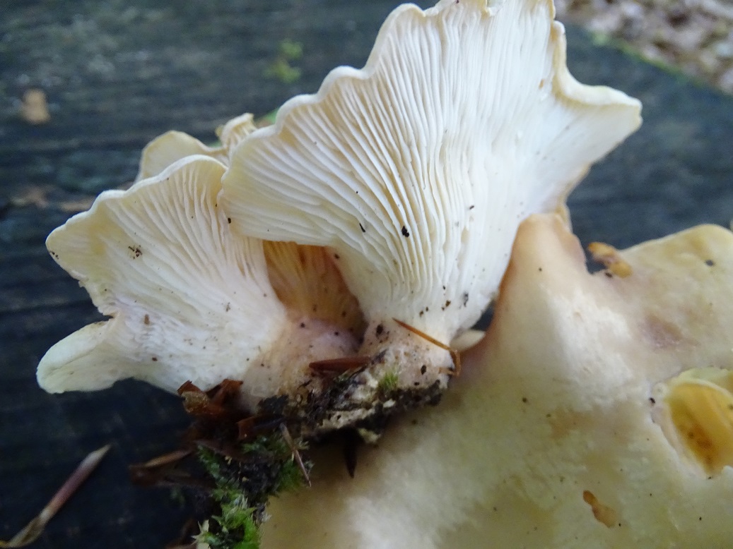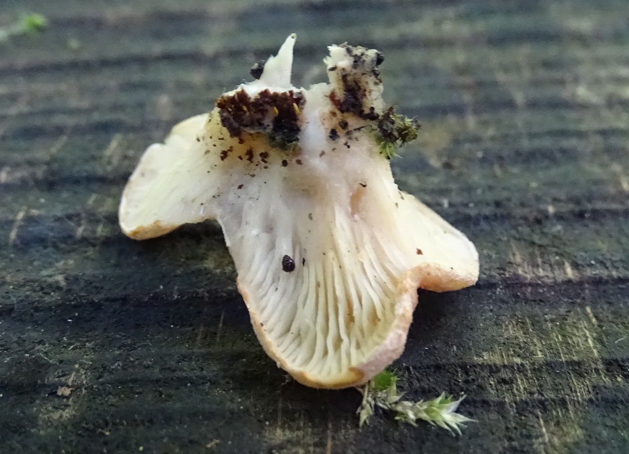 Mehrfach hier gefunden hatte ich hier auch schon Panus conchatus, aber der müsste ja noch deutlich farbiger sein, auch überständige Exemplare sind nicht so hell. Und für Crepidotus-Arten haben diese hier mir zuviel Stiel. Was meint ihr?