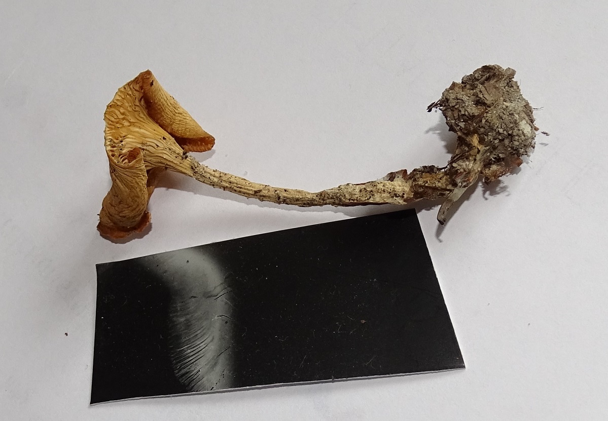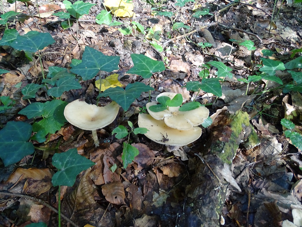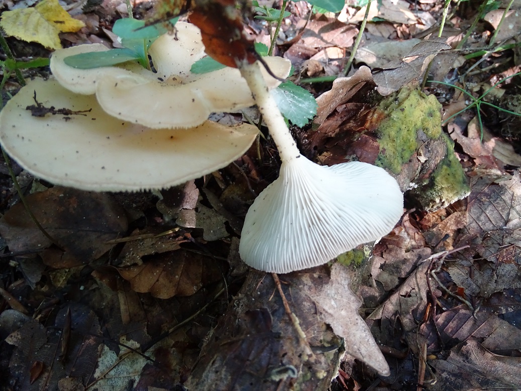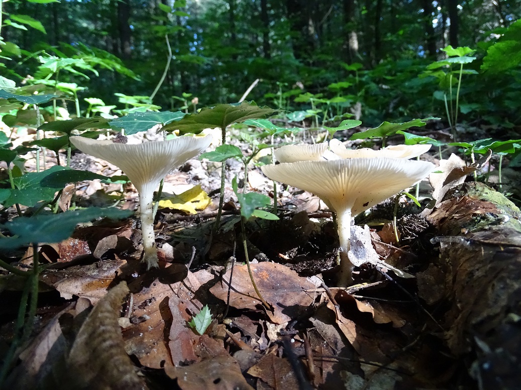 Gefunden ebenfalls am 28.07.2017 am Otterbach/Südpfalz (buchendominierter naturnaher bachbegleitender Hangwald). Farblich am besten das erste ungeblitzte Foto, die geblitzten sind "zu weiß". Die Pilze wirken auffällig schmächtig und dünnfleichig. Größe lässt sich anhand der Vegetation gut abschätzen - Hut ca. 4-5 cm, Stiel (jetzt trocken) auch 4-5 cm. Trocken ist der Stiel jetzt rillig. Spp. rein weiß.