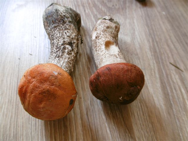 Heiderotkappe und Birkenrotkappe sind das selbe. Die linke mit den klar schwarzen Schuppen sieht wirklich sehr danach aus. Die rechte mit dem dunkleren Hut könnte(!) in der Tat eine Fichtenrotkappe sein, aber nur "könnte". Wie ich schon schrieb, musst du sie u.a. durchschneiden und die Verfärbung dokumentieren (auch über längere Zeit). Ich glaube aber nicht recht an die Fichtenrotkappe bei deinem Foto - die Huthaut steht mir zu weit über und der Hut sieht sehr faserschuppig aus, was für Leccinum versipelle typisch ist. Ich denke daher bei beiden eher an die Heiderotkappe.ich vermute hier zwei Arten. Links ist ziemlich sicher L. versipelle zu sehen (stark kontrastierende Stielschuppen, heller Hut).