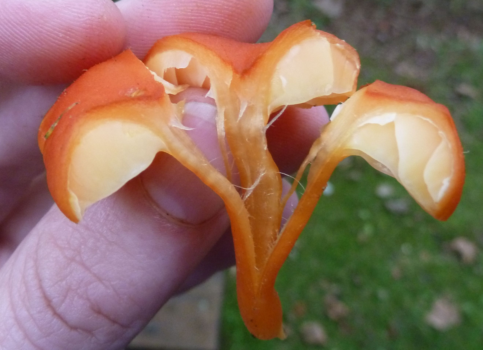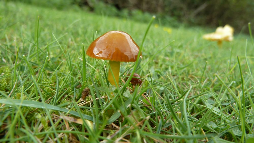 Und ein Stück daneben fand ich dann das hier. Beim Blättern im Laux auf der vergeblichen Suche nach den passenden Keulen stolperte ich zufällig über das Grüngelbe Gallertkäppchen: