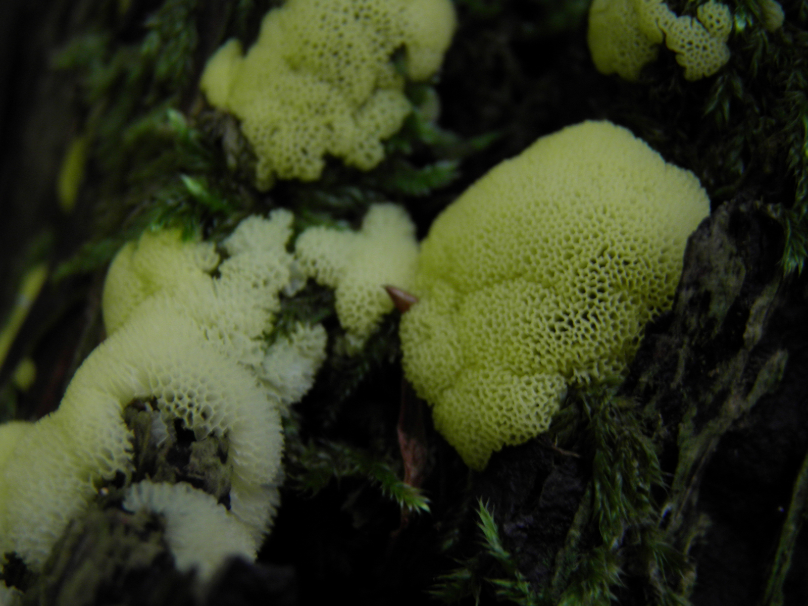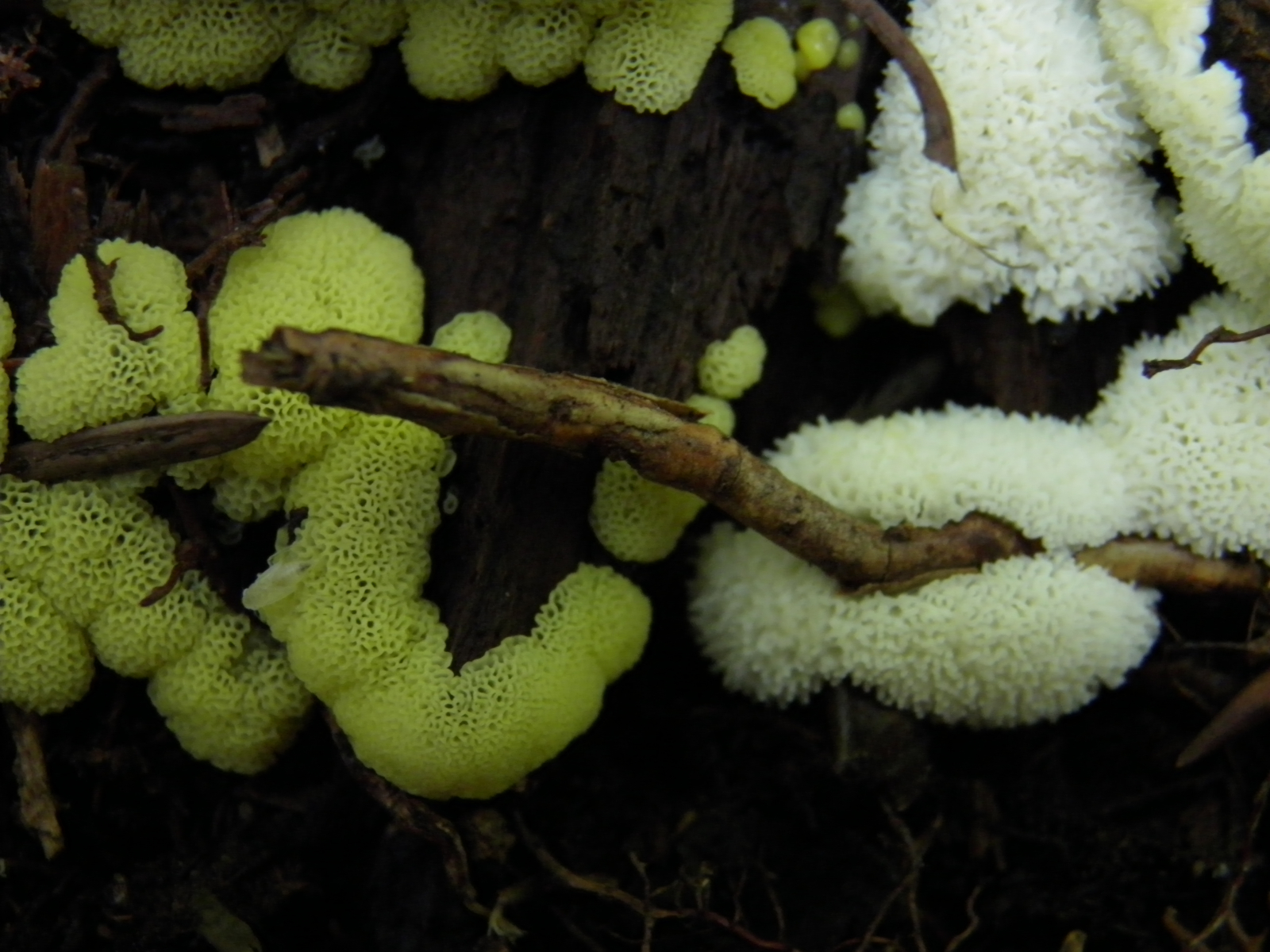 hier vermute ich den geweihförmigen schleimpilz CERATIOMYXA FRUTICULOSA VAR PORIOIDES, einmal gelb/einmal weiß und dann die farbliche übergangsform (unterschiedliche reifegrade?)9