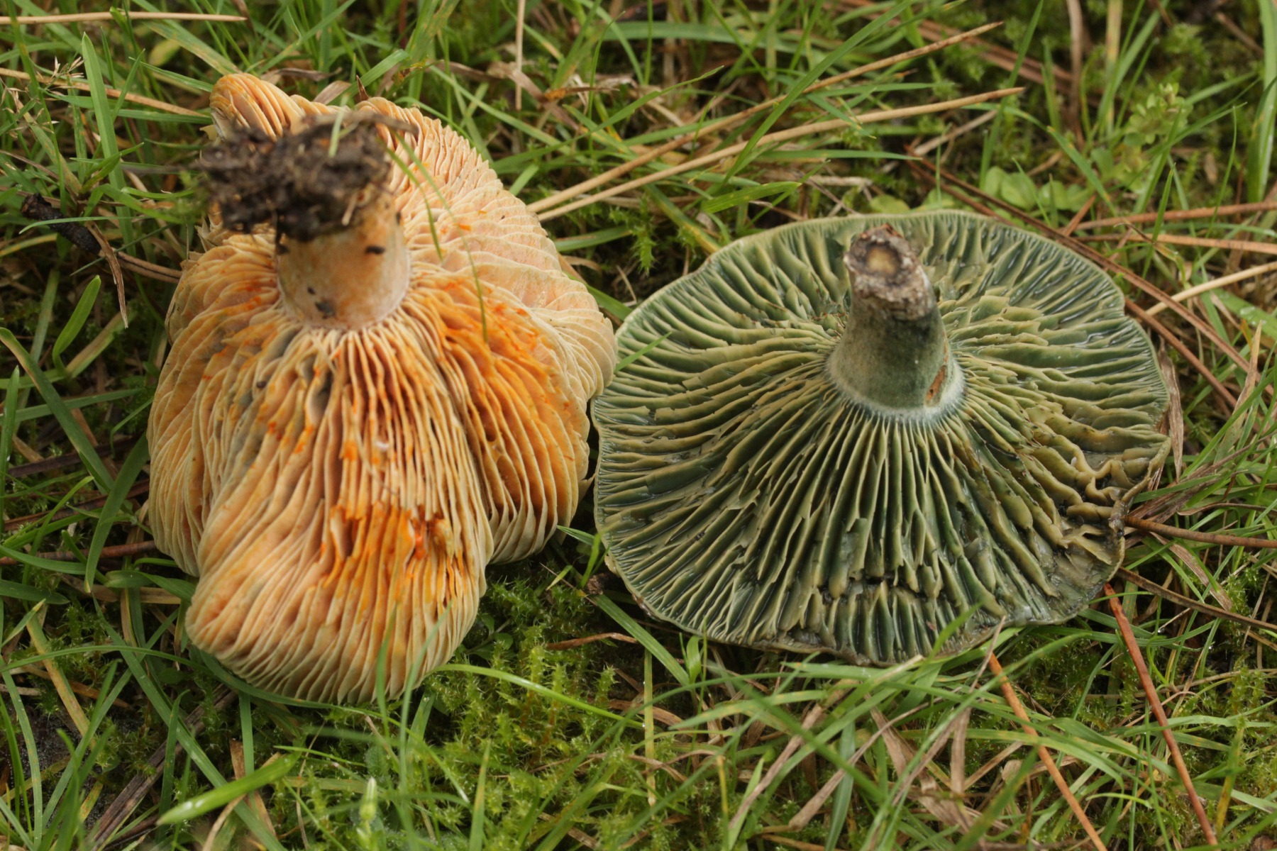 9. Ein Reizker unter Kiefer, ich würde auf Lactarius semisanguifluus tippen. Das rechte Exemplar lag da schon gepflückt, das linke Exemplar ist frisch.