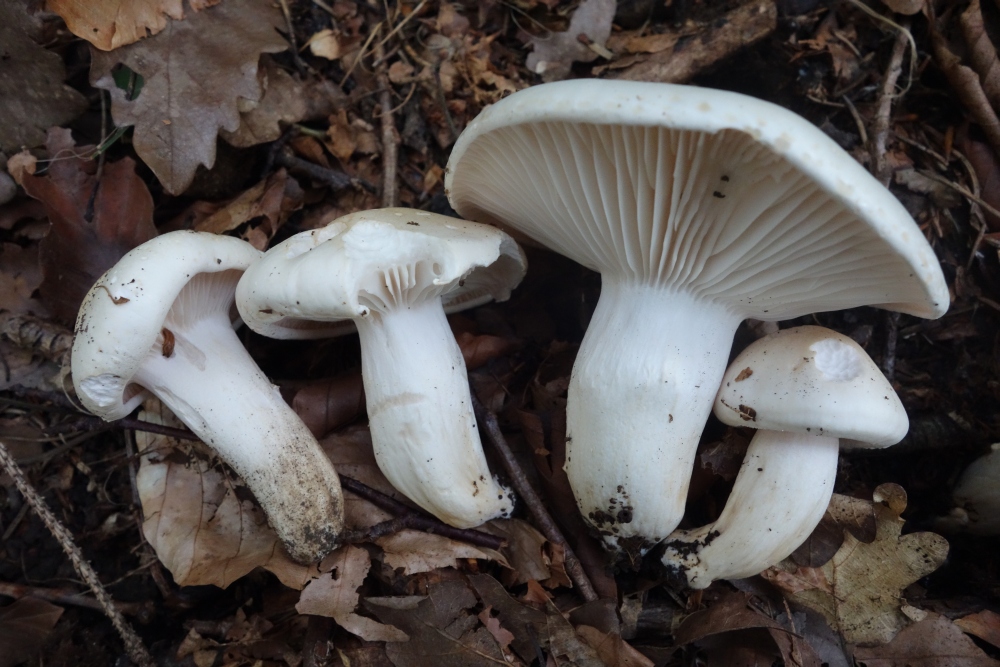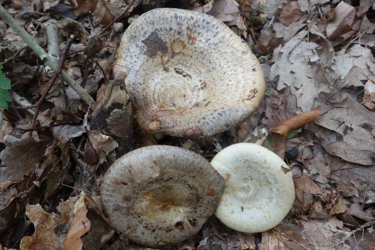 Korallenmilchlinge - Milchlinge mit rosa verfärbender Milch - tarnen sich mit ihren bräunlich-gräulich fleckigen Hüten gut im alten Laub, sind aber häufige Arten im Forst. Gemeinerweise sehen viele Arten sehr ähnlich aus und wachsen auch durchmischt am gleichen Standort. Während der Rosaanlaufende Milchling (Lactarius acris) leicht zu erkennen ist weil die Milch innerhalb von wenigen Sekunden verfärbt (sowohl am Fleisch als auch isoliert davon) ist für mich die Unterscheidung der anderen sehr ähnlich aussehenden Arten L. pterosporus, L. ruginosus und L. azonites kaum möglich. Gibt es da verlässliche makroskopische Merkmalsunterschiede? Hier zu sehen sind vermutlich verschiedene Arten. Nr. 3 ist zweifelsohne L. acris. Ob die anderen unterschiedliche Arten sind...tja.. :shy: