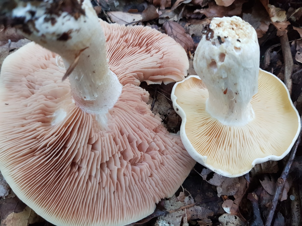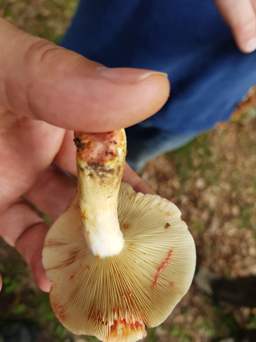 Der Edelreizker (Lactarius deliciosus) ist jedes Jahr an einem feuchteren Senke mit vielen Kiefern zu finden. Dieses Jahr stand dort jedoch noch einen anderen Milchling den man von oben auch für einen Edelreizker halten könnte. Beim Blick auf die Unterseite wird man aber eines Besseren belehrt: die Lamellen mit einem violettlichen Schimmer sowie die sofort weinrote Milch entlarven ihn als Blutreizker (Lactarius sanguifluus). Persönlicher Erstfund!