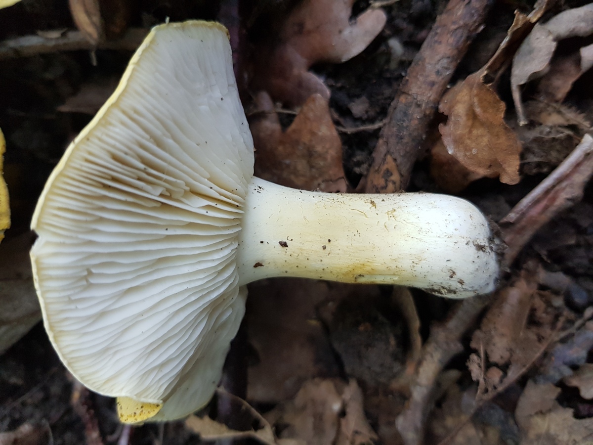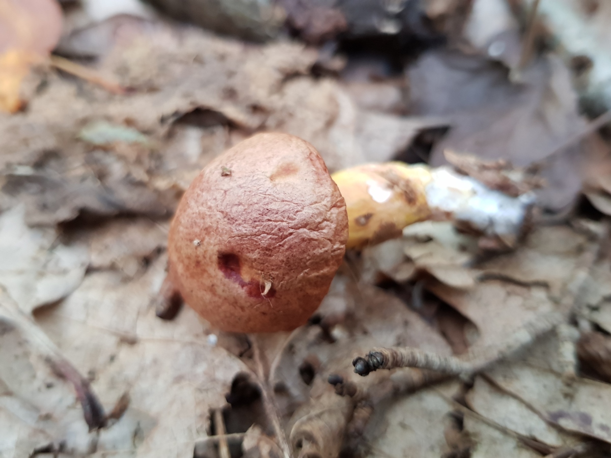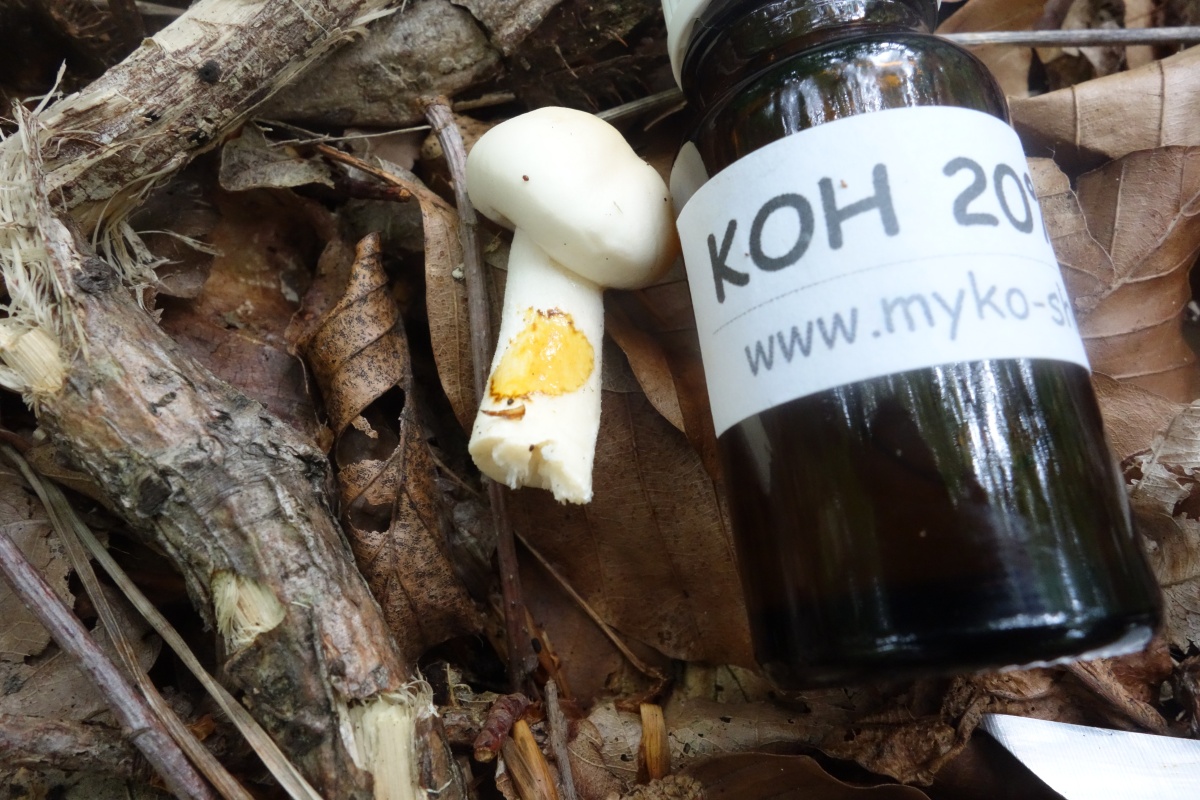 Gut dass ich etwas Chemie dabei hatte. So kann ich den Beweis antreten dass sich bei meinem Fund um den Gelbverfärbender Schneckling (Hygrophorus discoxanthusssss) handelt und nicht um den (zumindest frisch) ähnlich aussehenden Verwandten Elfenbeinschneckling (H. eburneus) der nicht auf KOH reagieren soll.