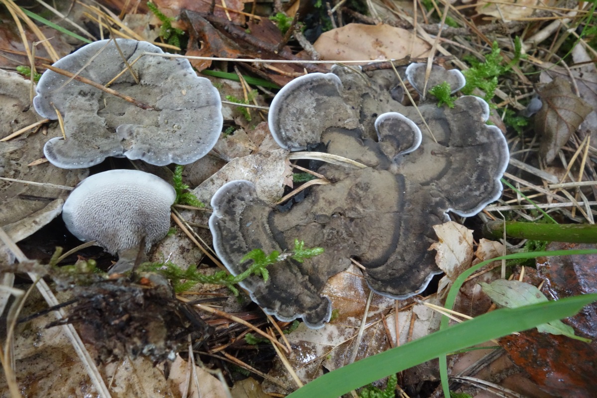 Dieser Stacheling ist jedes Jahr in großer Zahl an immer der gleichen Stelle zu finden - jenes oben beschriebene Areal mit Kiefern und einigen Birken. Hier ist es meist feuchter als im umgebenden Laubmischwald. An dieser Stelle tritt diese Art stellenweise wie gesät auf. In trockenem Zustand riecht sie zudem kräftig nach Maggi. Mir fehlt die Erfahrung mit den Stachelingen, würde ihn aber als den Schwarzen Duftstacheling (Phellodon niger) ansprechen.