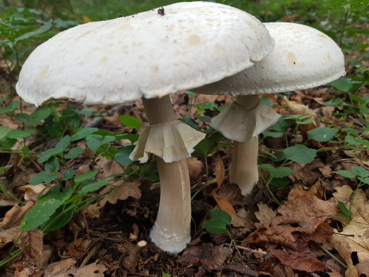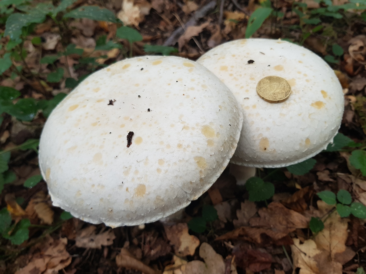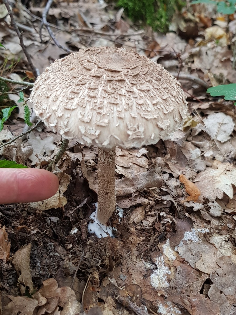 Einige kleinere Parasole (Macrolepiota procera) hatten sich auch in den Wald verirrt.