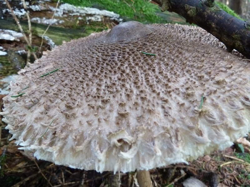heute in Fichten-Lärchen-Mischwald auf basischem Basalt gefunden. Die Hutschuppen sind sehr leicht abzuwischen, der ganze Pilz wattig-weich. Ist das ein Jungfern-Schirmling?