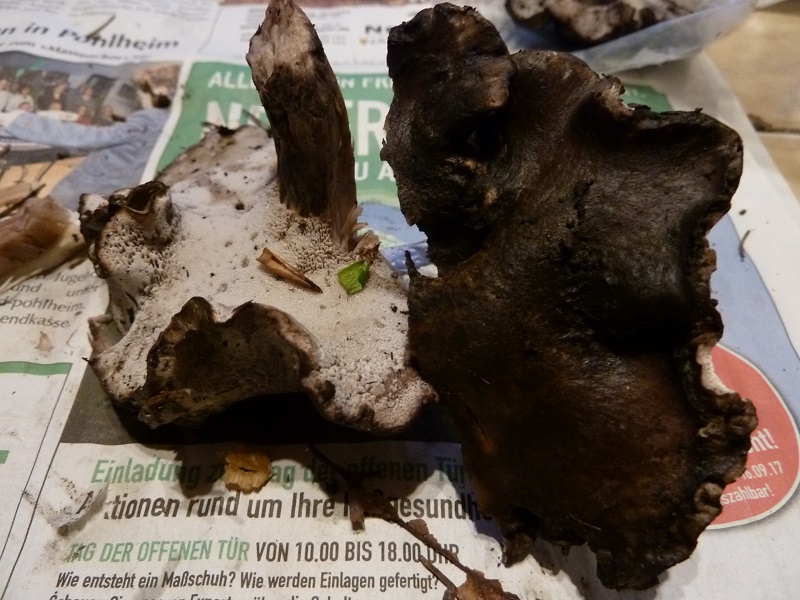 diese dunkelbraunen Porlinge mit hellgrauer Porenschicht habe ich gestern im Eichen-Hainbuchenwald auf basischem Basalt nur zufällig entdeckt, als ich mich wegen Herbsttrompeten tief herunterbücken musste. Durch den kurzen Stiel und die unregelmäßige Hutform war der Pilz auf dem dunklen Boden richtig gut getarnt, zumal die Lichtverhältnisse wegen dichter Regenwolken sehr schlecht waren.