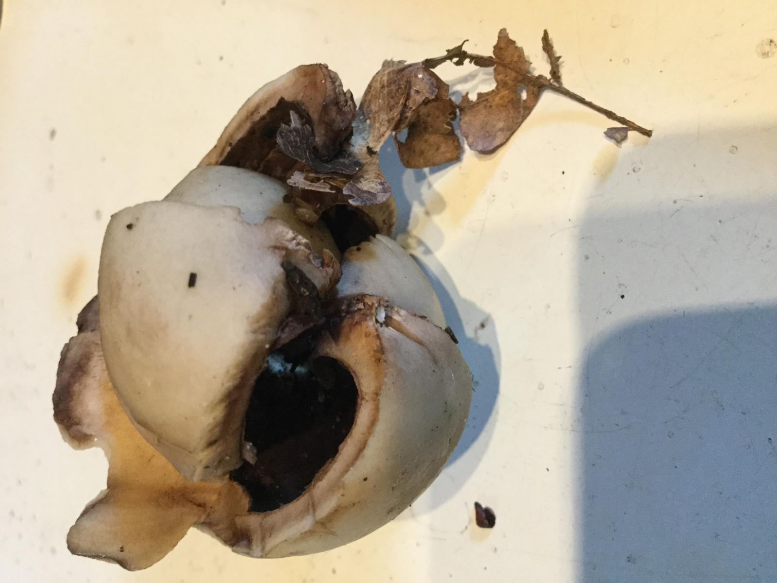 Riecht nach nix, unterer Teil in 4 irrten aufgesprungen, oben drauf sowas wie n Knopf. Durchmesser ca 4,5cm unten , 2cm oben. Höhe ca 4cm. Wuchs im Grüppchen am mischwaldrand.