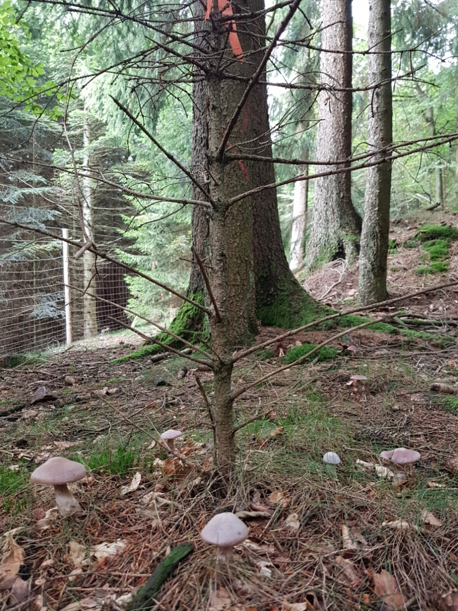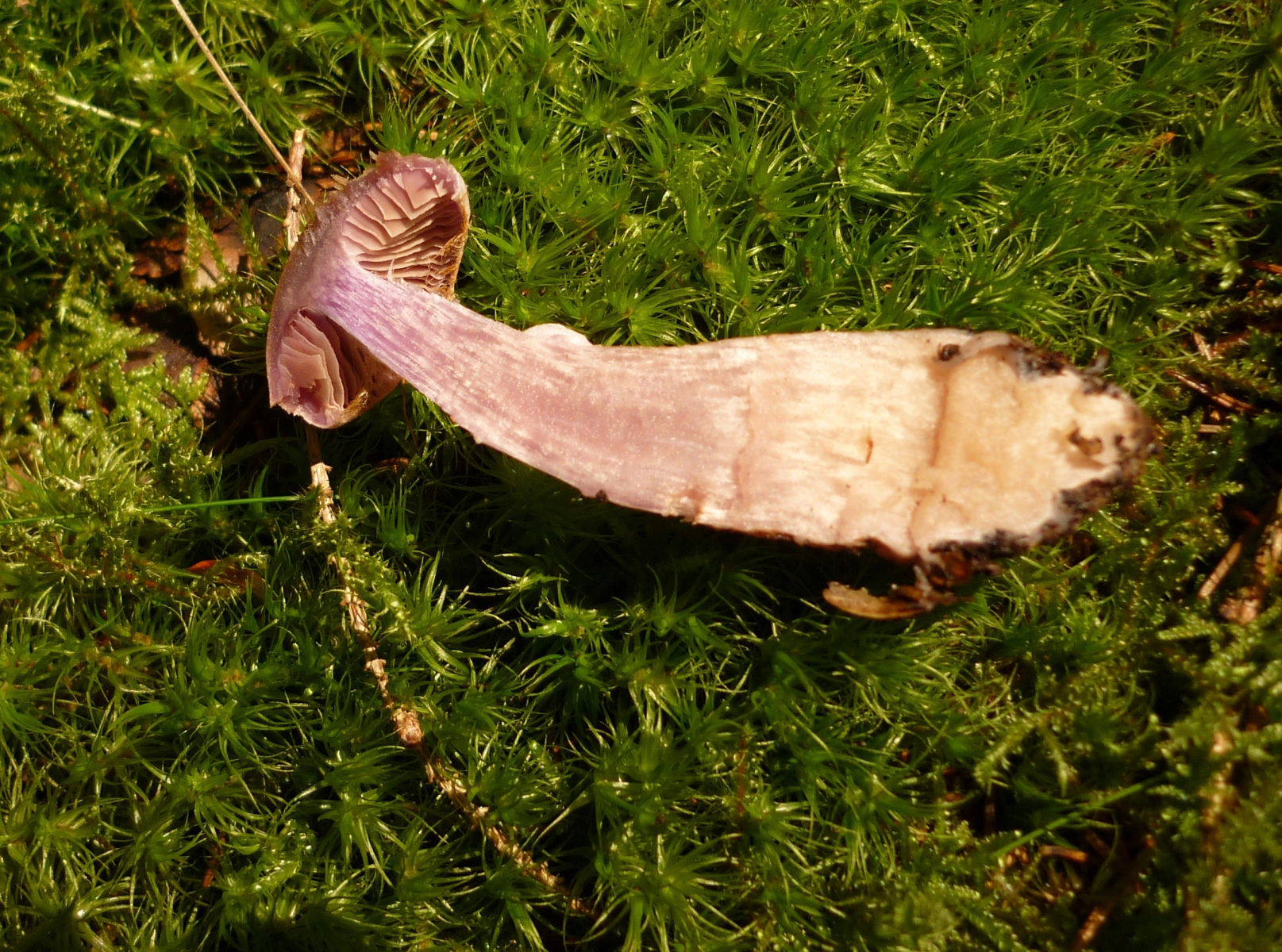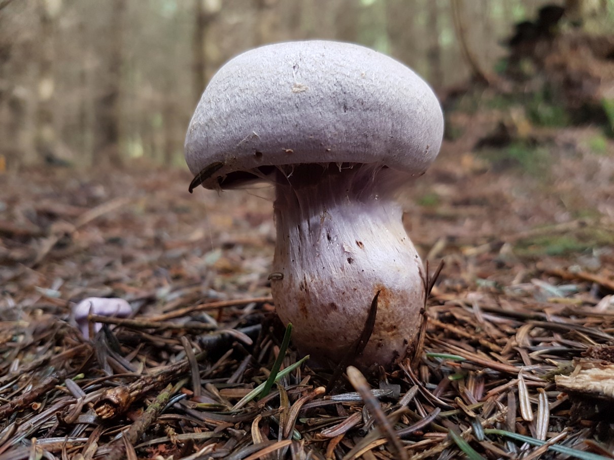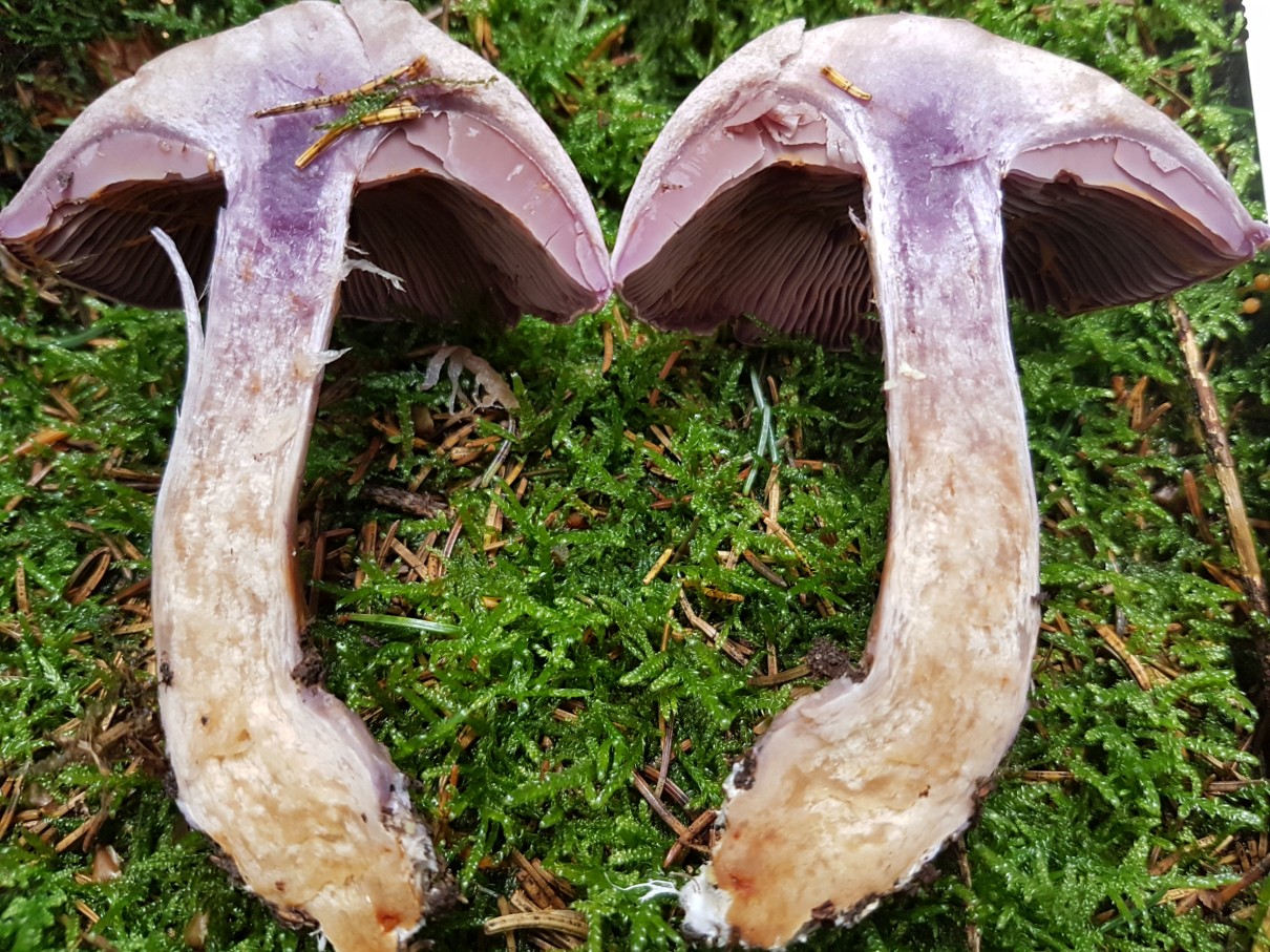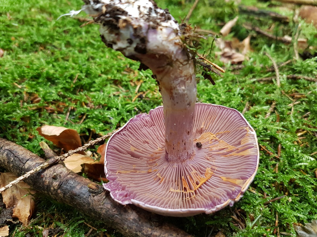 2] Doch der Wald war Lila, überall, ich hoffte so sehr auf Lepista Nuda, doch da waren auch immer Schleierreste und ich denke, die Sporenfarbe braun passt auch nicht. Und ich erinnere mich an den angenehmen Geruch, der hier sicher nicht vorhanden war. Daher in Ermangelung an Alternativen komme ich doch immer wieder auf den Bocksdickfuß (CORTINARIUS CAMPHORATUS).