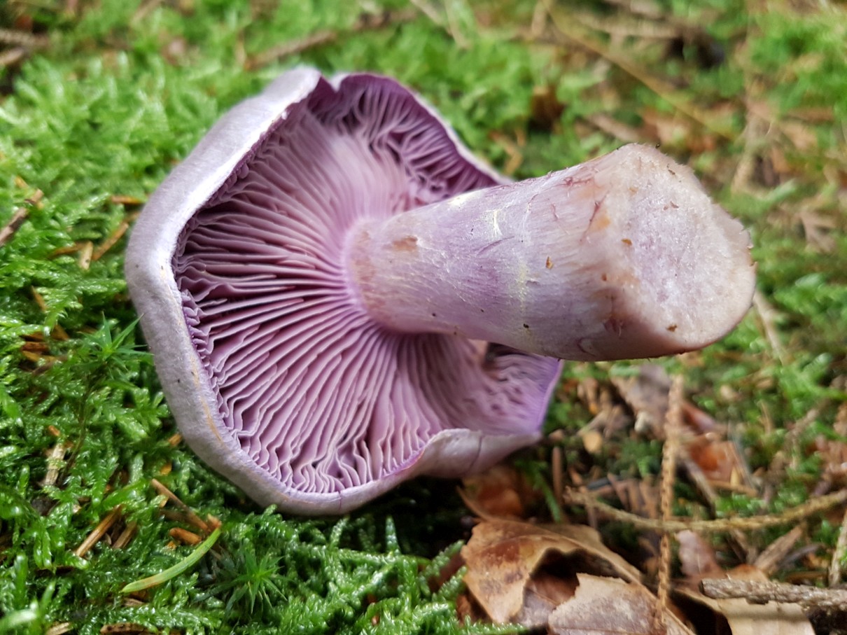 2] Doch der Wald war Lila, überall, ich hoffte so sehr auf Lepista Nuda, doch da waren auch immer Schleierreste und ich denke, die Sporenfarbe braun passt auch nicht. Und ich erinnere mich an den angenehmen Geruch, der hier sicher nicht vorhanden war. Daher in Ermangelung an Alternativen komme ich doch immer wieder auf den Bocksdickfuß (CORTINARIUS CAMPHORATUS).