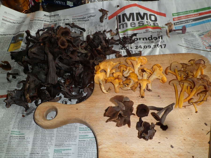 Auf dem Weg gab es ein paar Pfifferlinge und ein paar Trompetenpfifferlinge, die zusammen mit einem kleinen Teil der späteren Funde, Rührei und frischen Brot, bereits in meinem Magen gelandet sind. Lecker!