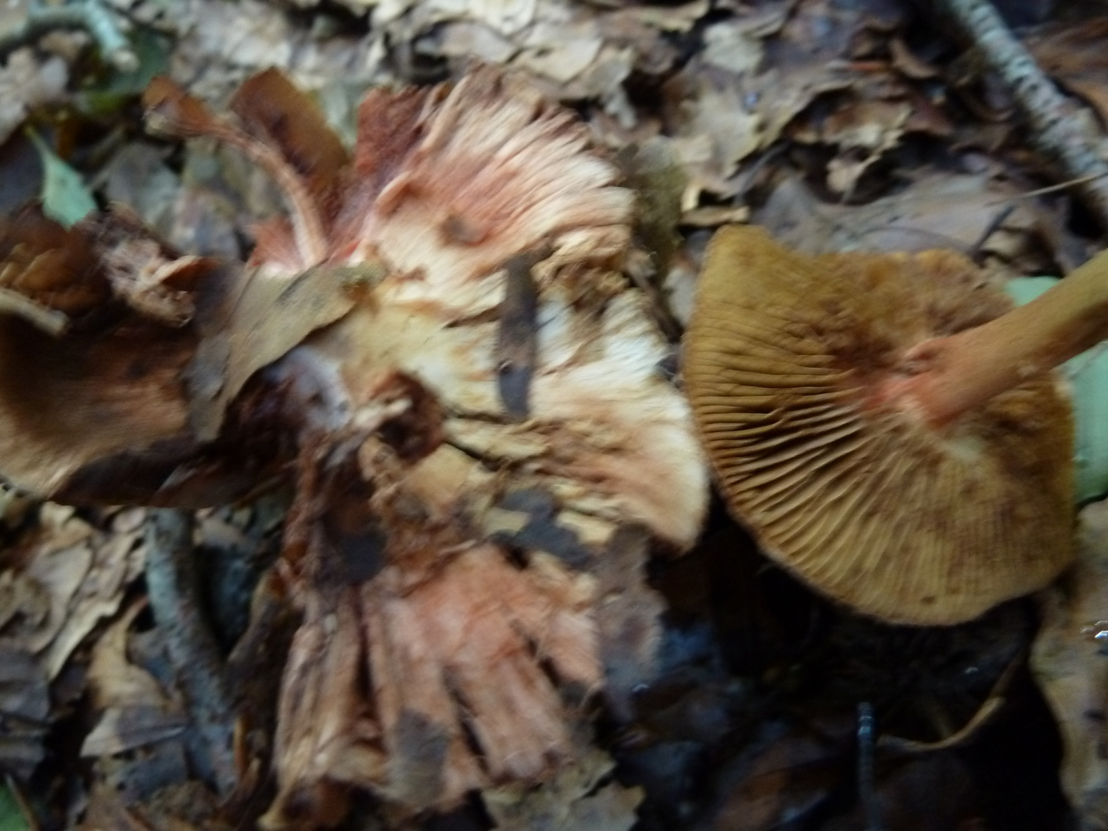 Von der zweiten Art mit weinrötlichen Flecken habe ich leider nur die beiden schon ziemlich angeschlagenen Fruchtkörper gefunden. Ich habe mal auf Dittes Seite geguckt, die schreibt zu recht dass der Geruch eines Pilzes von fünf Personen auf fünf verschiedene Arten umschrieben wird.