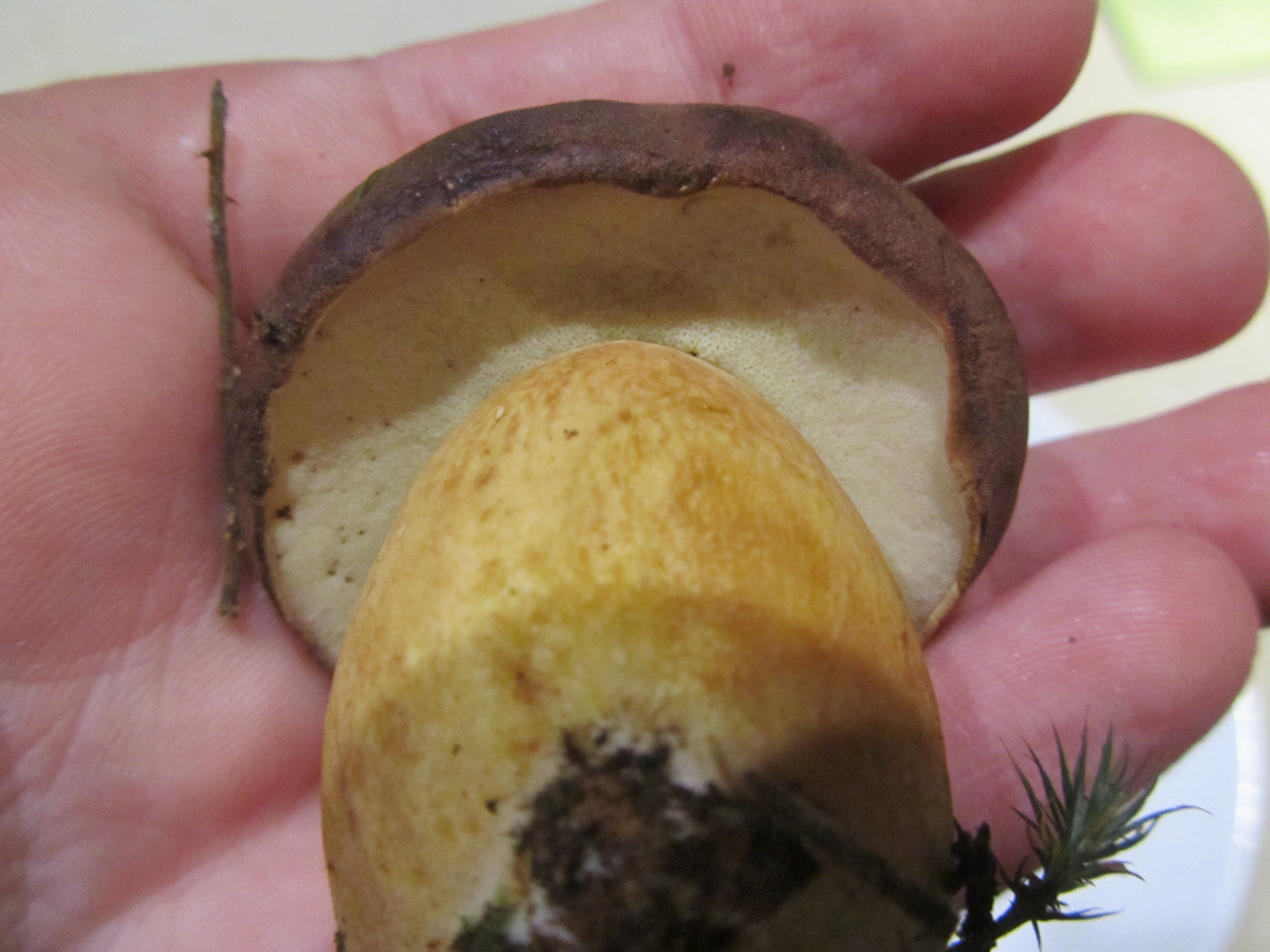 Aber Maronenröhrlinge haben doch einen dünneren Stiel und laufen beim Aufschneiden blau an, der hier bleibt schneeweiß im inneren auch 10 Minuten nach dem Aufschneiden.