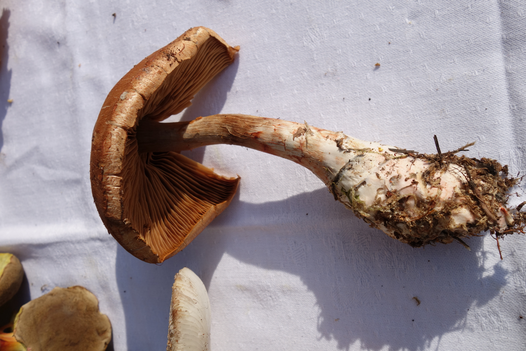 Bild 9 + 10: Ein Schleierling, vermutlich der Geschmückte Gürtelfuß (Cortinarius armillatus), auch wenn die leuchtend orangenen Velumbänder am Stiel etwas abgegriffen sind.