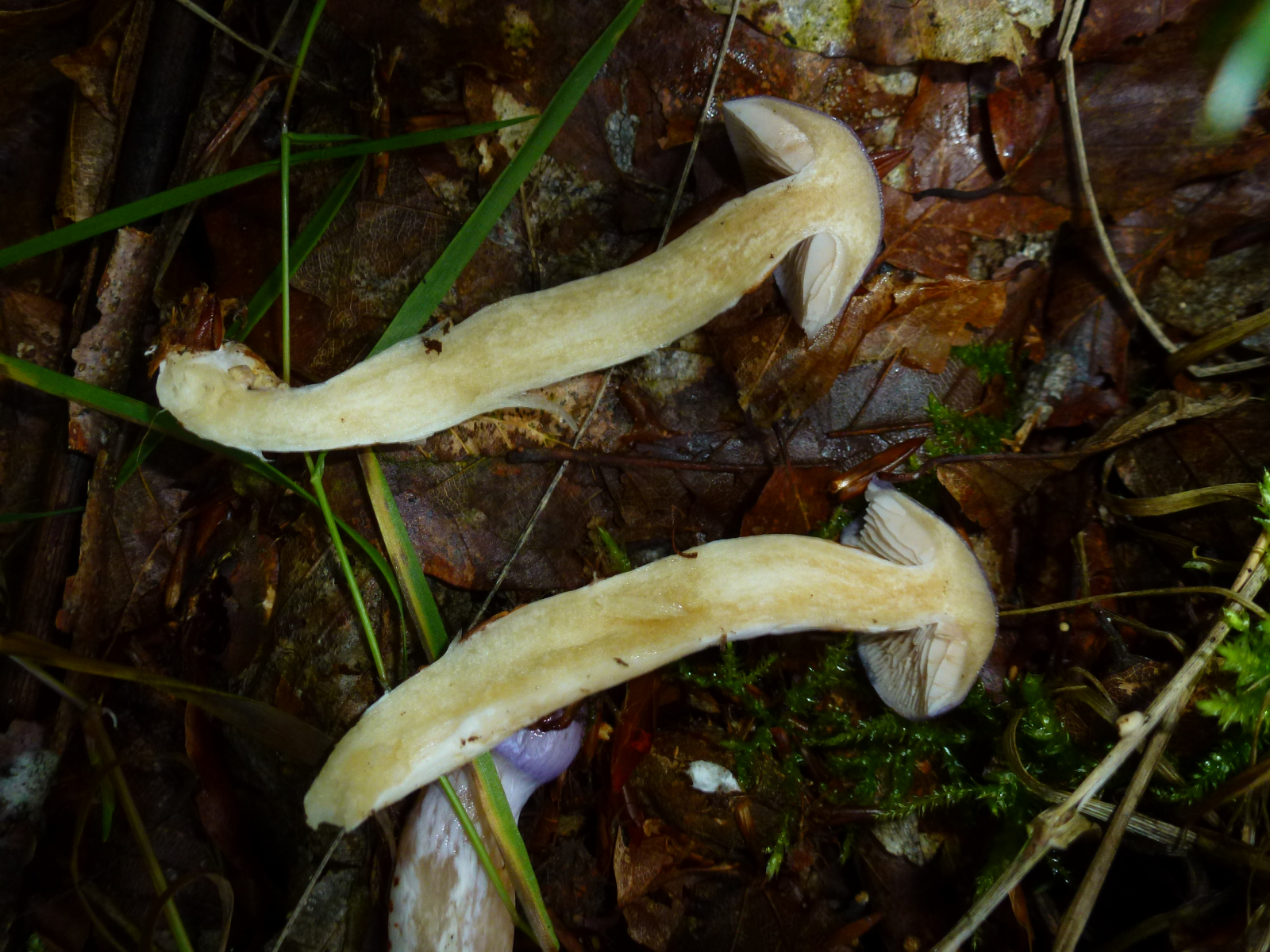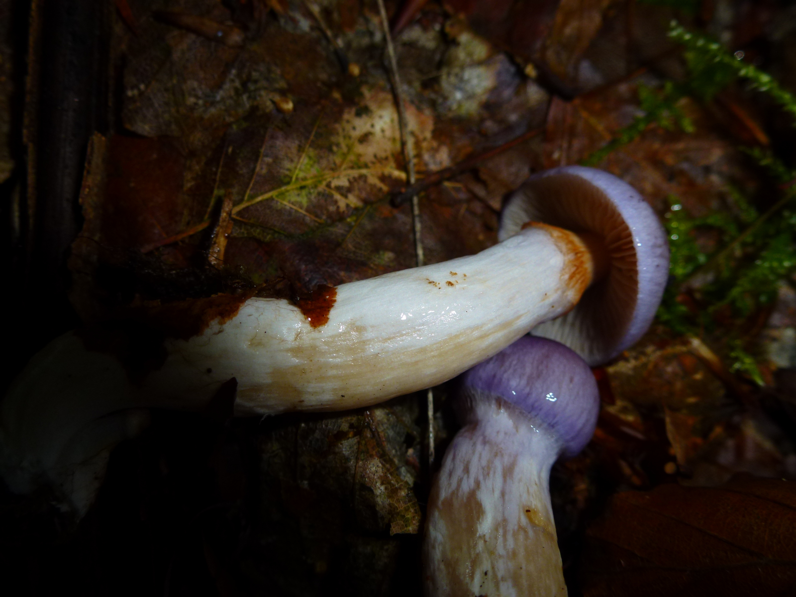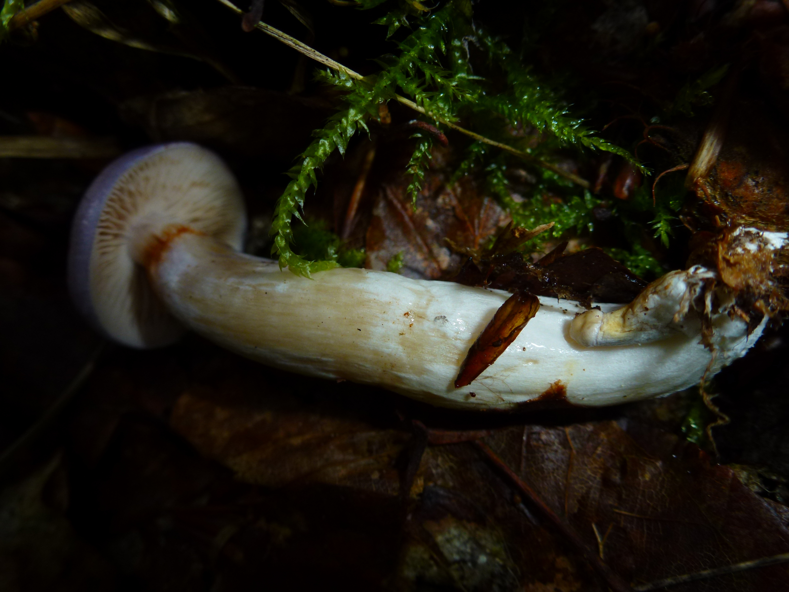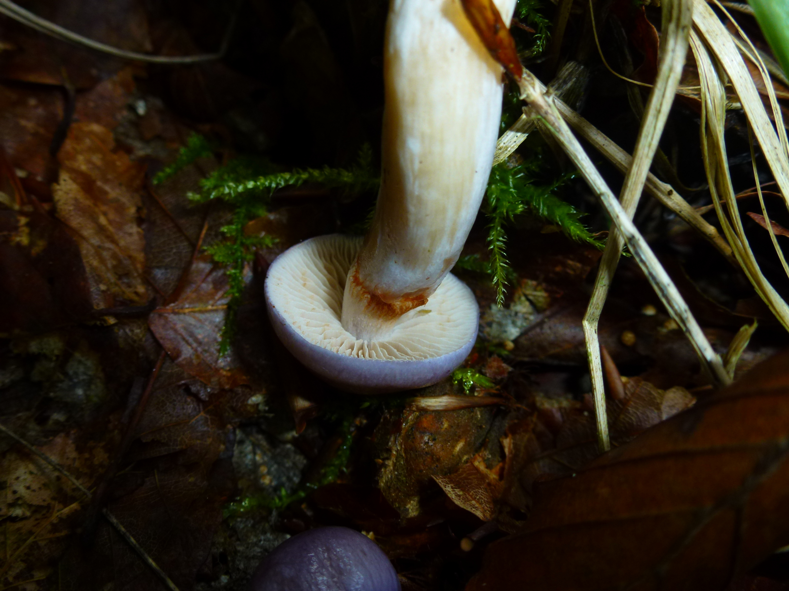 bei den nachfolgenden Pilzen dachte ich eigentlich, es wäre schon alleine wegen der auffälligen Lila-Farbe des Hutes einfacher zumindest in die Nähe einer Bestimmung zu kommen. Mmmmh - weit gefehlt. Das einzige ähnliche Lila fand ich bei einem Klumbfuss ![]()