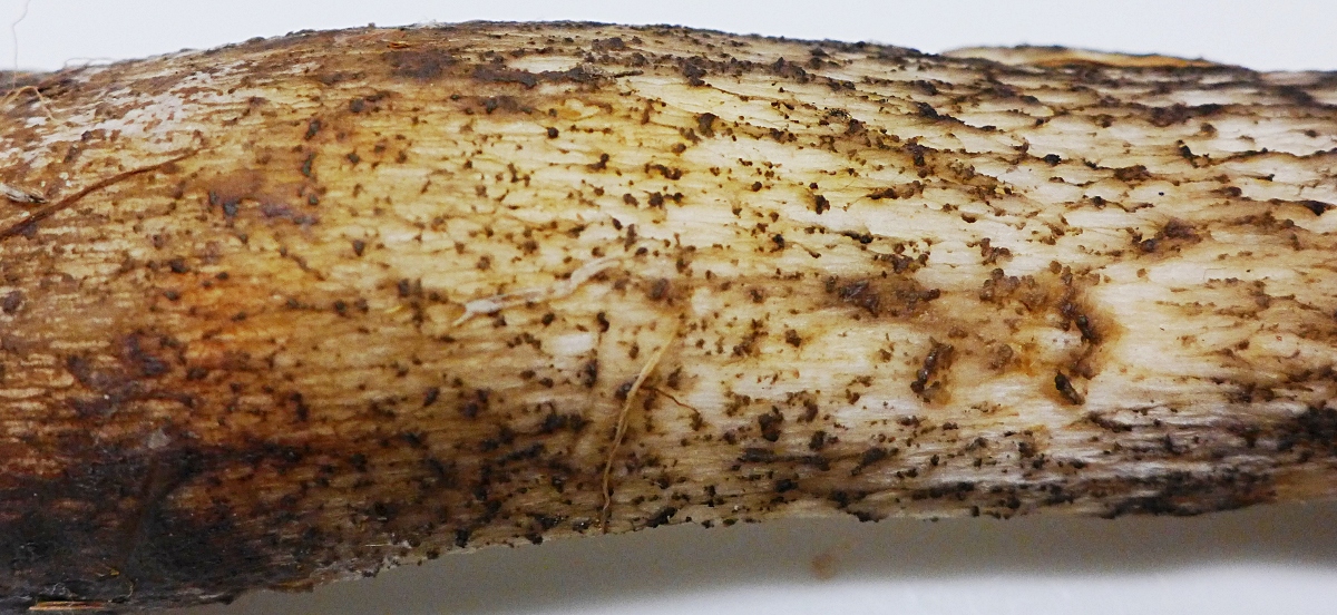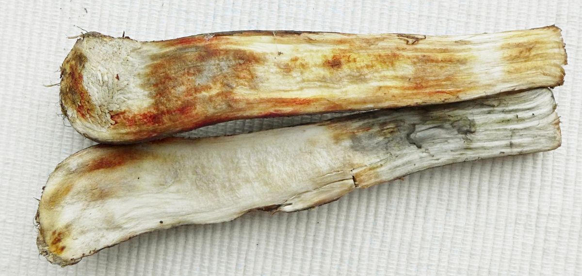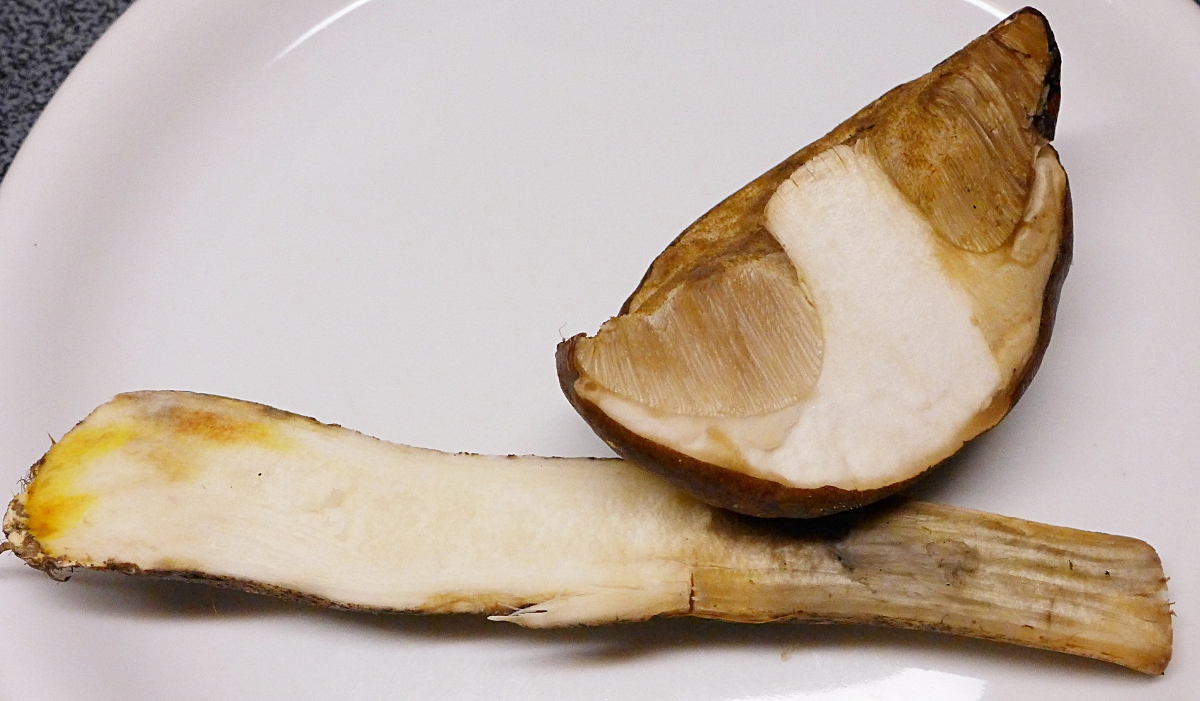 Im Schnitt zuerst sehr lange weiß bleibend, in der Stielbasis diese gelb-braunen Flecken schon vorhanden
