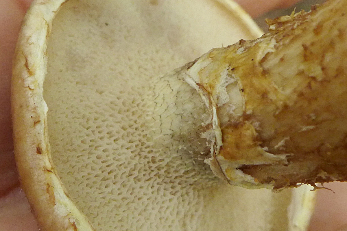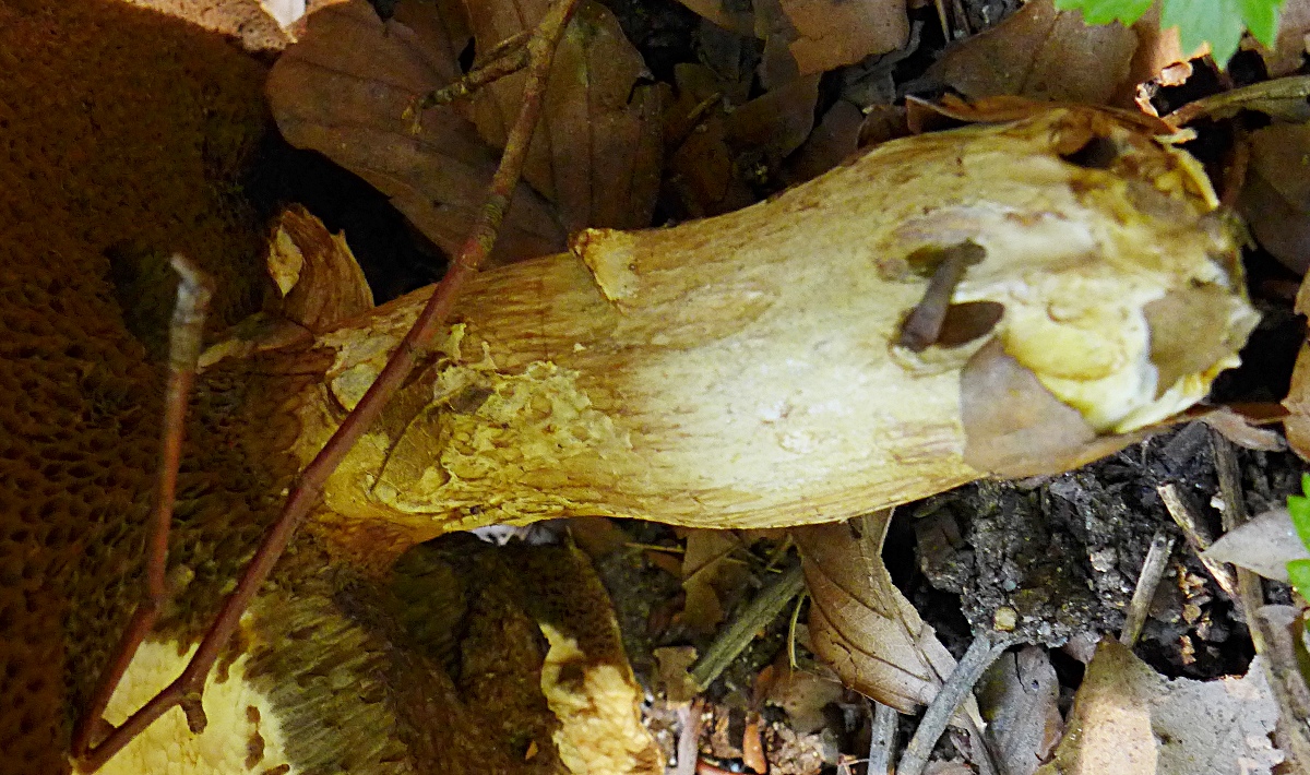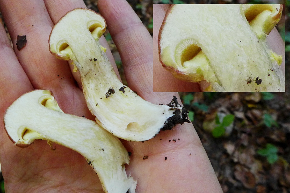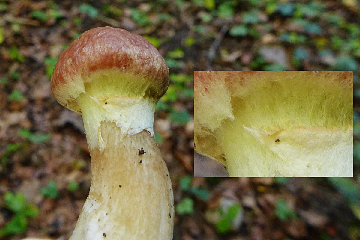 Die Oberflächenfarbe ist am Rande heller, der Stiel hat eindeutig gelbliche Anteile, Ringrest (Velumrest) gelblich, die Poren waren noch rel. hell und mit Grauschleier.