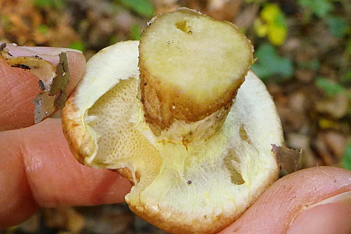 Die Oberflächenfarbe ist am Rande heller, der Stiel hat eindeutig gelbliche Anteile, Ringrest (Velumrest) gelblich, die Poren waren noch rel. hell und mit Grauschleier.