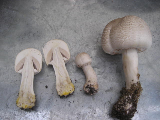 Na gut, aber in diesem Fall hat die gelbanlaufende Stielbasis makroskopische Priorität. Wiesenchampignons würden maximal etwas rosalich im Fleisch anlaufen und hätten keinen typischen Geruch (also weder nach Anis noch nach Tinte), auch wären die Hüte jung gleichmäßiger halbrund geformt und die Stiele kürzer.