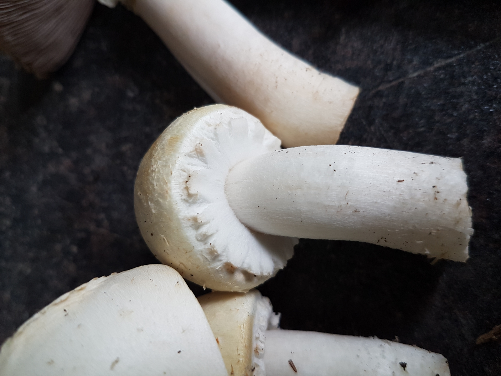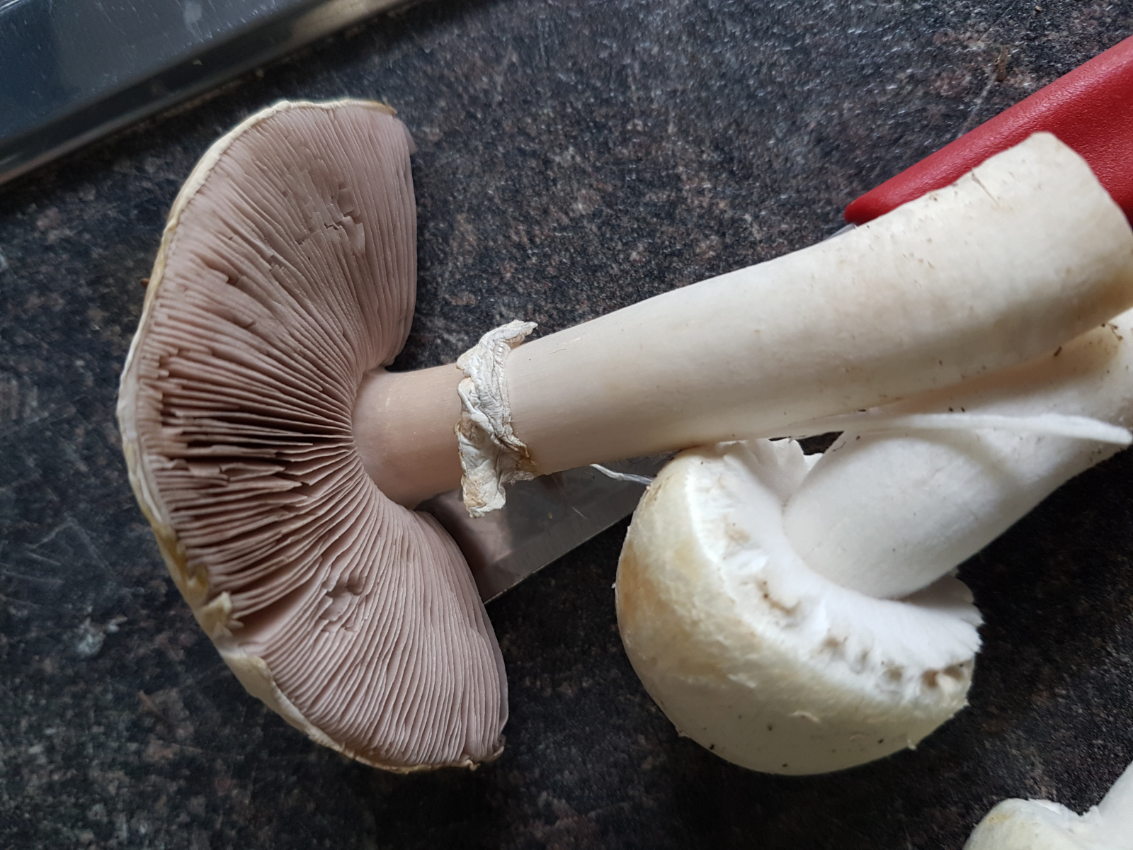 Diese unterseits belegten Ringe gibt's übrigens bei einem ganzen haufen an Arten aus der Anischampi - Gruppe. Und auch bei manchen Arten aus ganz anderen Sektionen, ist also auch kein wirklich solides Merkmal. Allerdings: Wenn es doch Anischampis sind, dann wird's eh keine exakte Artbestimmung geben, ob mit oder ohne Stielbasis. Weil die weißlichen Arten sich letztlich nur anhand der Sporenform und -größe wirklich trennen lassen. Aber in die Gruppe kommt man: Die eher schmächtigen Fruchtkörper in geschlossenen Wäldern gehören zu 95% zu Gruppe um den Schiefknolligen und Dünnfleischigen Anischampi (Agaricus essettei und Agaricus sylvicola), die kräftigen, großen dickfleischigen auf Wiesenflächen zu 95% in die Gruppe um den Schafchampi, Runsporigen Champi und Großsporigen Anischampi (Agaricus arvensis & Agaricus osecanus / nivescens & Agaricus macrosporus / urinascens). Die Fruchtkörper mit richtig fetten, beinahe parasolgroßen Hüten aus Fichtenforsten sind meistens Agaricus macrocarpus (ähm... Großfrüchtiger Anischampignon, glaube ich).