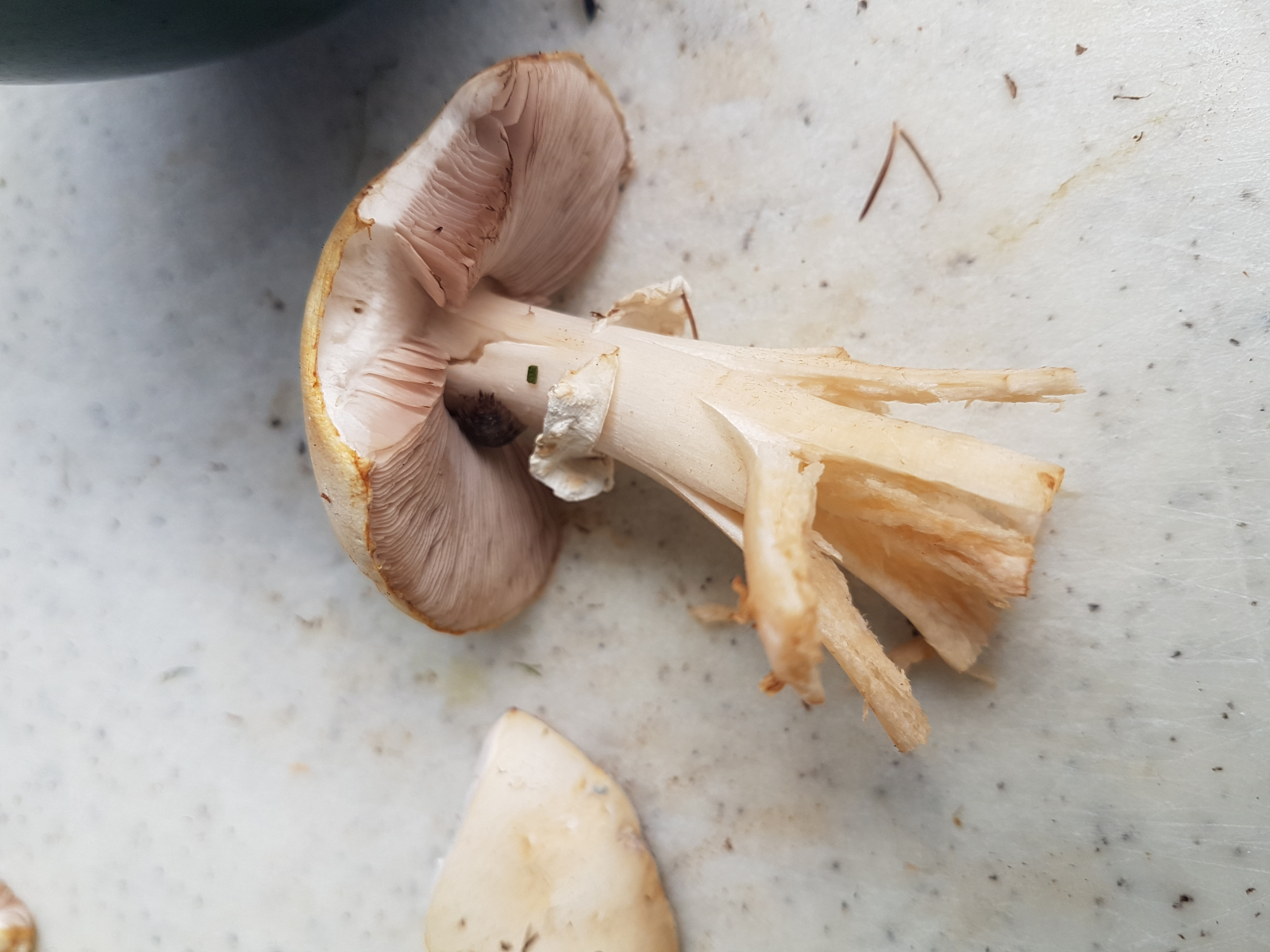 Die Lamellen sind Rosa. Der Ring hst unten kleine gelbliche Tupfen.
