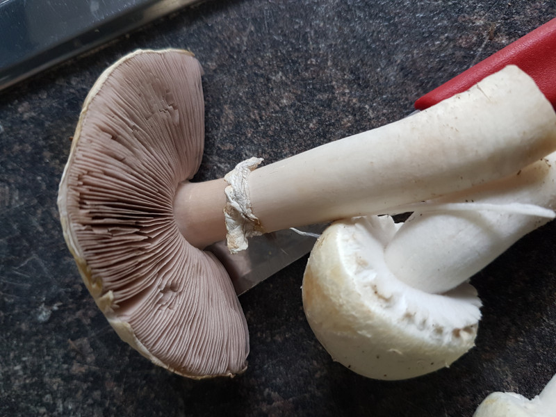 Die Lamellen sind Rosa. Der Ring hst unten kleine gelbliche Tupfen.