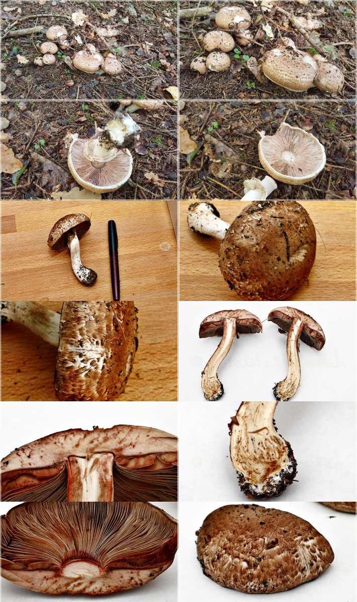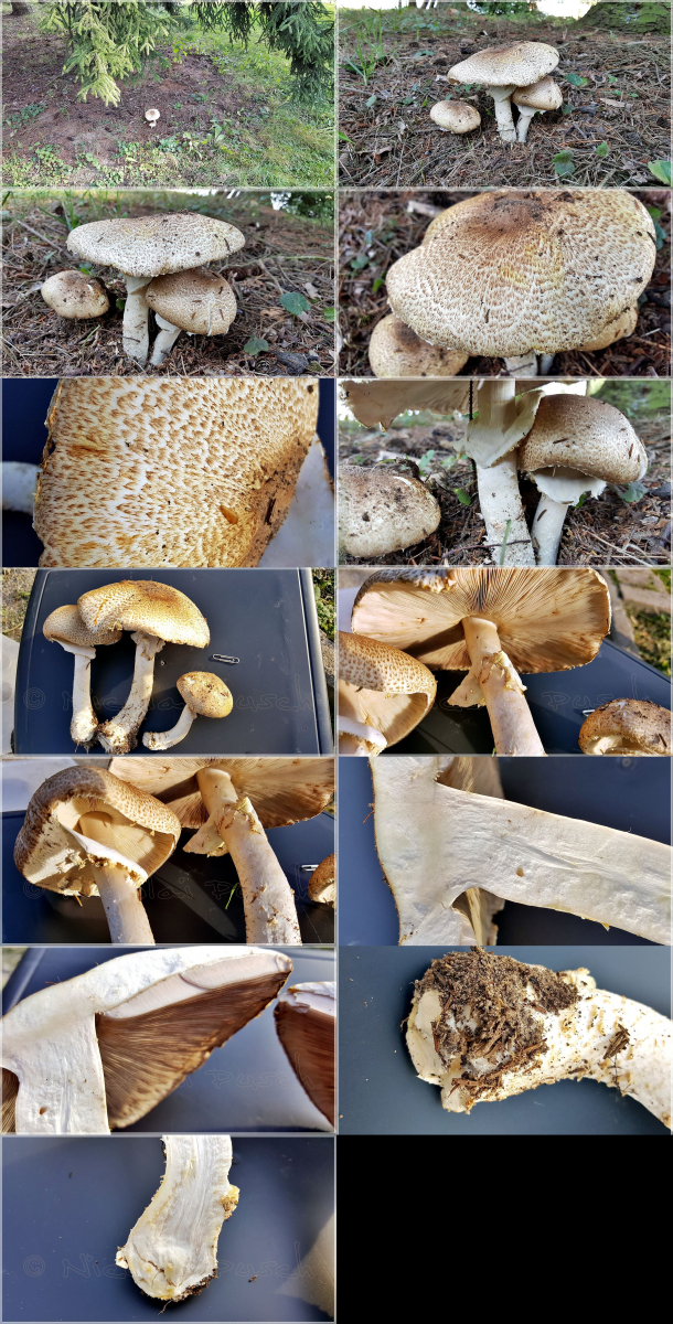 Nun habe ich ihn nochmal in jünger und dazu noch zwei weitere, die ich für einen Braunschuppigen Riesenchampignon (60%) und einen Waldchampignon (90%) halte.