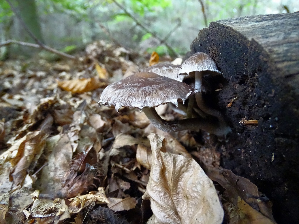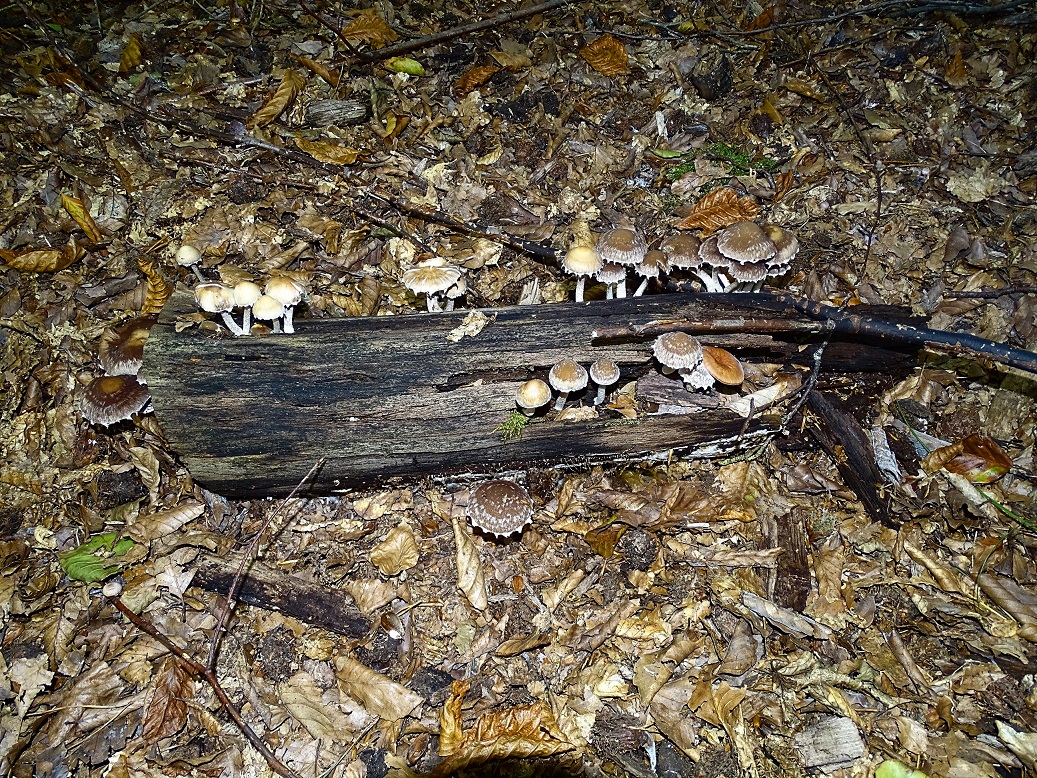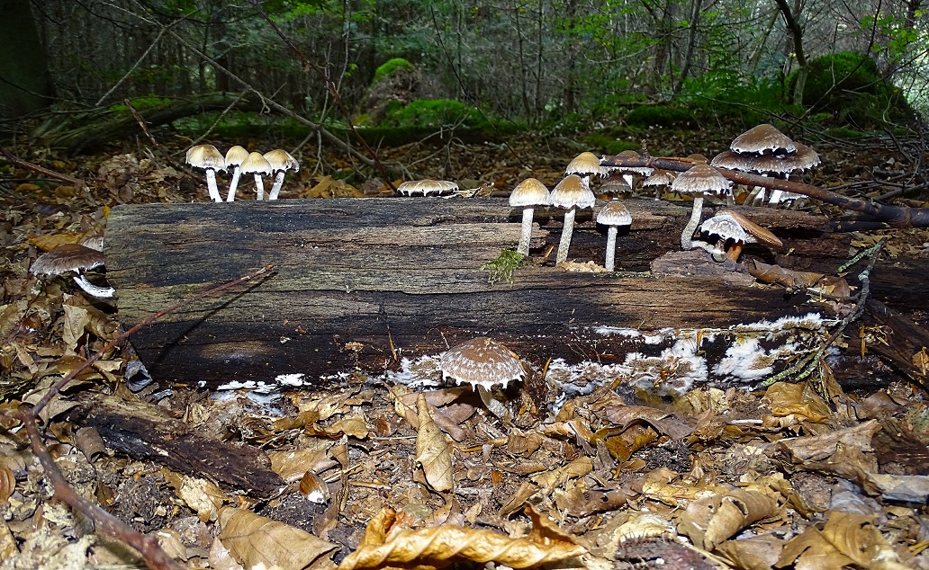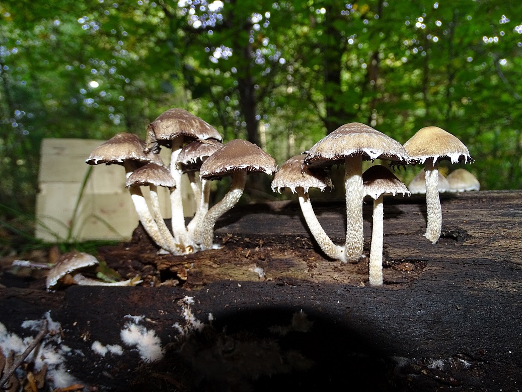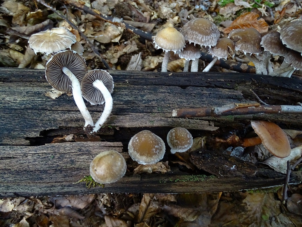 auch den von gestern, Bienwald / Südpfalz, auf schon ziemlich vermorschten Holz. Auffällig der weißflockig behangene Hut, so dass ich Bilder für "faserlling behangen" gescuht hatte. Dabei stieß ich auf dieses Bild was ziemlich 1:1 mit meinen gefundenen Ex. übereinstimmt. Damit steht Psathyrella olympiana - Weißflockiger Mürbling im Raum, nach den GPBW relativ selten, wobei die Ökologie stimmt (planare Buchen- und Eichen-Hainbuchenwälder).