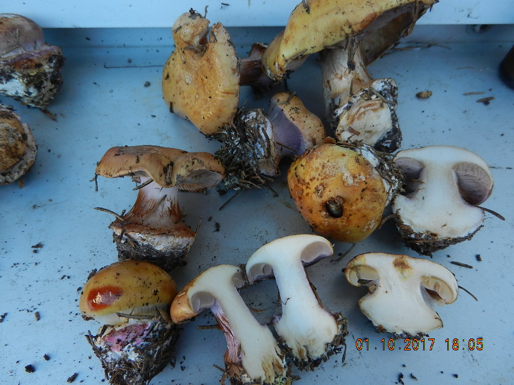 ein Calochroi unter Fichte oder Tanne (vergesellschaftet mit Cortinarius atrovirens) mit ockergelbem Hut, violetten Lamellen, violetter Stielrinde und violettem Velum; auf der Huthaut befinden sich disjunkte, helle Velumflocken wie bei bestimmten beflockten Amaniten; an der Bulbipellis hängen leuchtend schwefelgelbe Rhizomorphen (auf dem Bild blöderweise nicht zu sehen, d. h. das muss man mir glauben); KOH-Reaktion zweifach positiv: auf der Huthaut blutrot, auf der Bulbipellis pink (siehe das linke untere Exemplar auf dem Foto!); Stielfleisch ohne Violetttöne in der oberen Stielhälfte, sondern einfach nur weißlich;