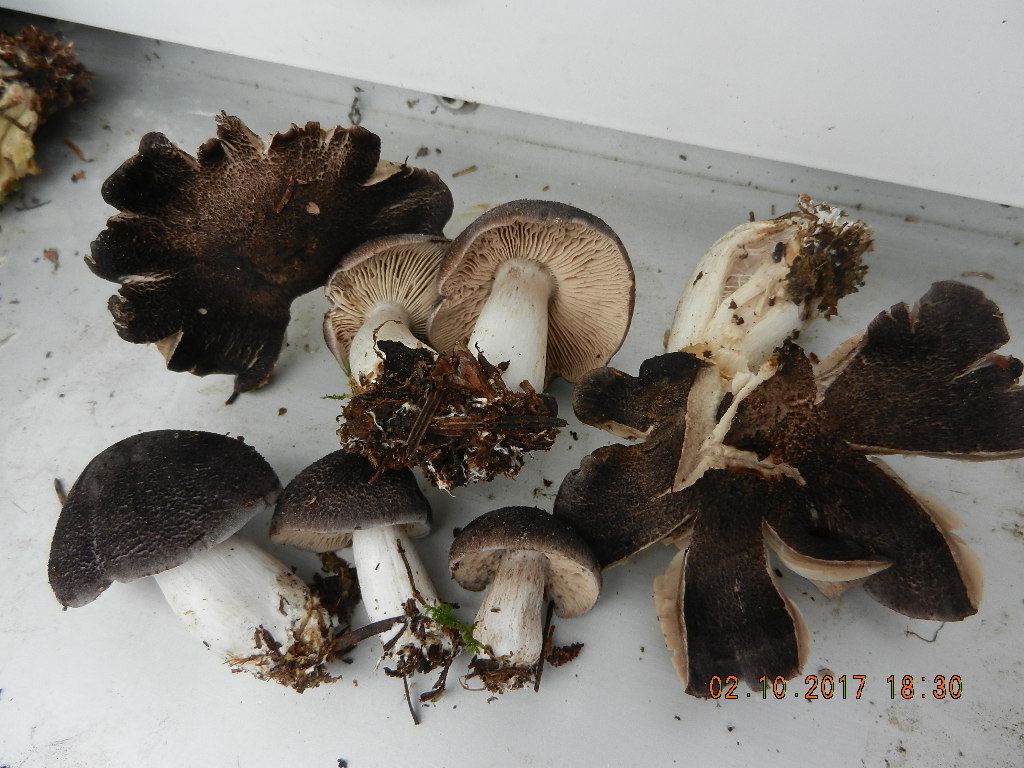 und einen interessanten Erdritterling unter Fichte, der durch die äußerst dunkle, schon schwarz zu nennende Hutschuppung sowie durch den leichten Fleischrosaschein in den Lamellen auffällt; da die Rhizomorphen an der Stielbasis weiß und nicht gelb sind, ist das nicht T. orirubens. Ich vermute hier T. atrosquamosum und werde gleich Literatur dazu wälzen und eine Geruchsprobe durchführen: