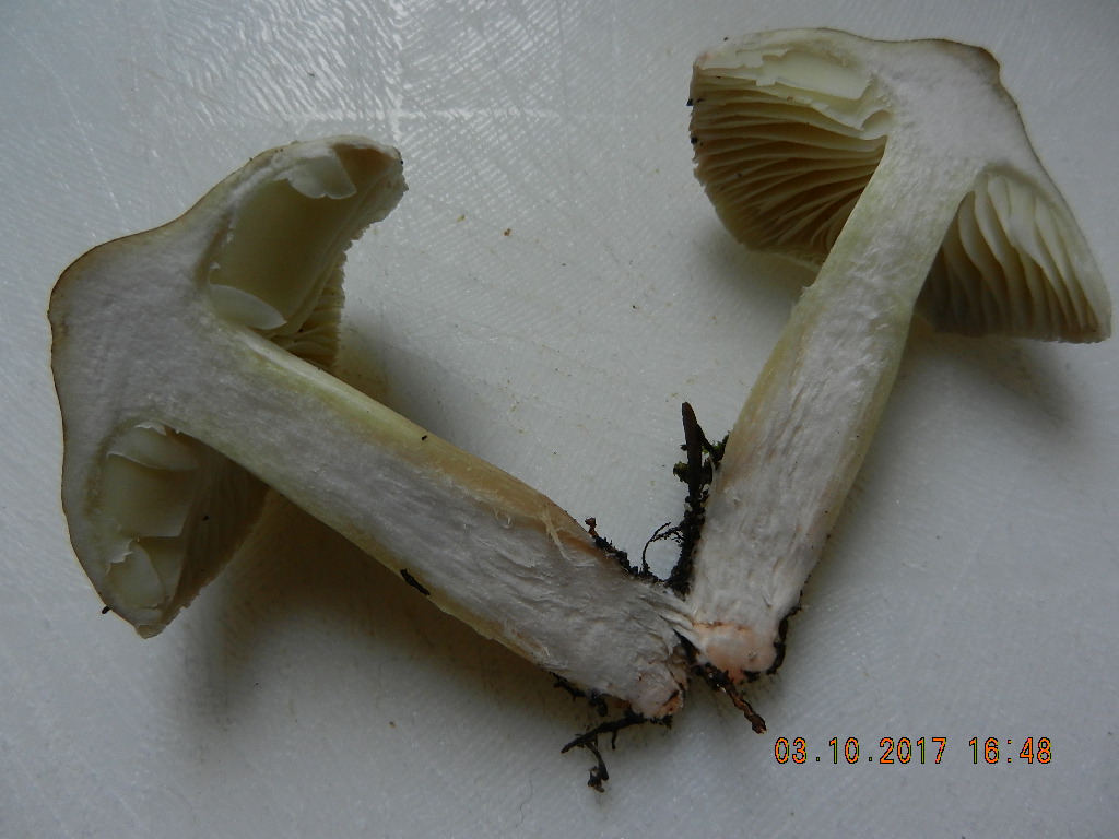 Tricholoma rapipes, aus der Seifenritterlingsgruppe, mit hell olivgrünem Hut und stark rötendem Fleisch: