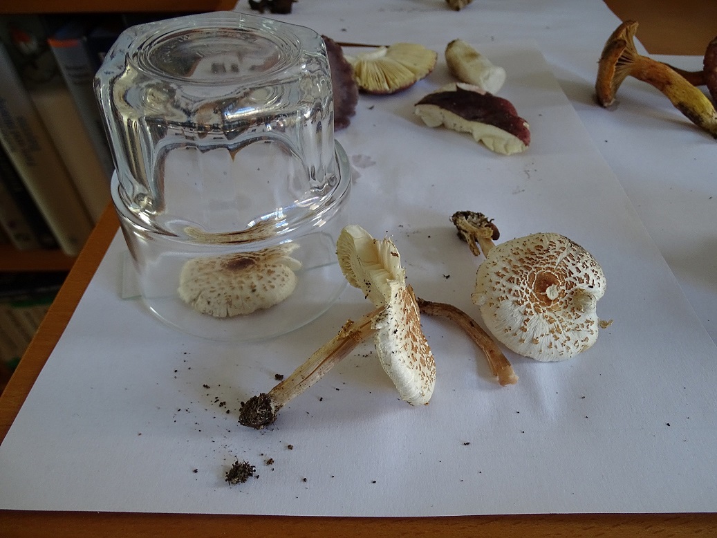 Unter anderem habe ich die unten gezeigten kleine rotbräunlichen Schirmlinge gefunden. Leider kommt der Rotton im Braun auf den Bildern fats überhaupt nicht rüber, weder beiden Standortfotos noch bei den beiden Schreibtischfotos.