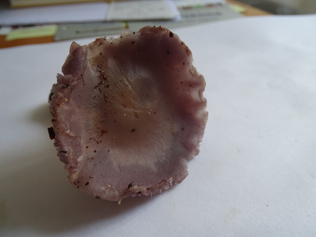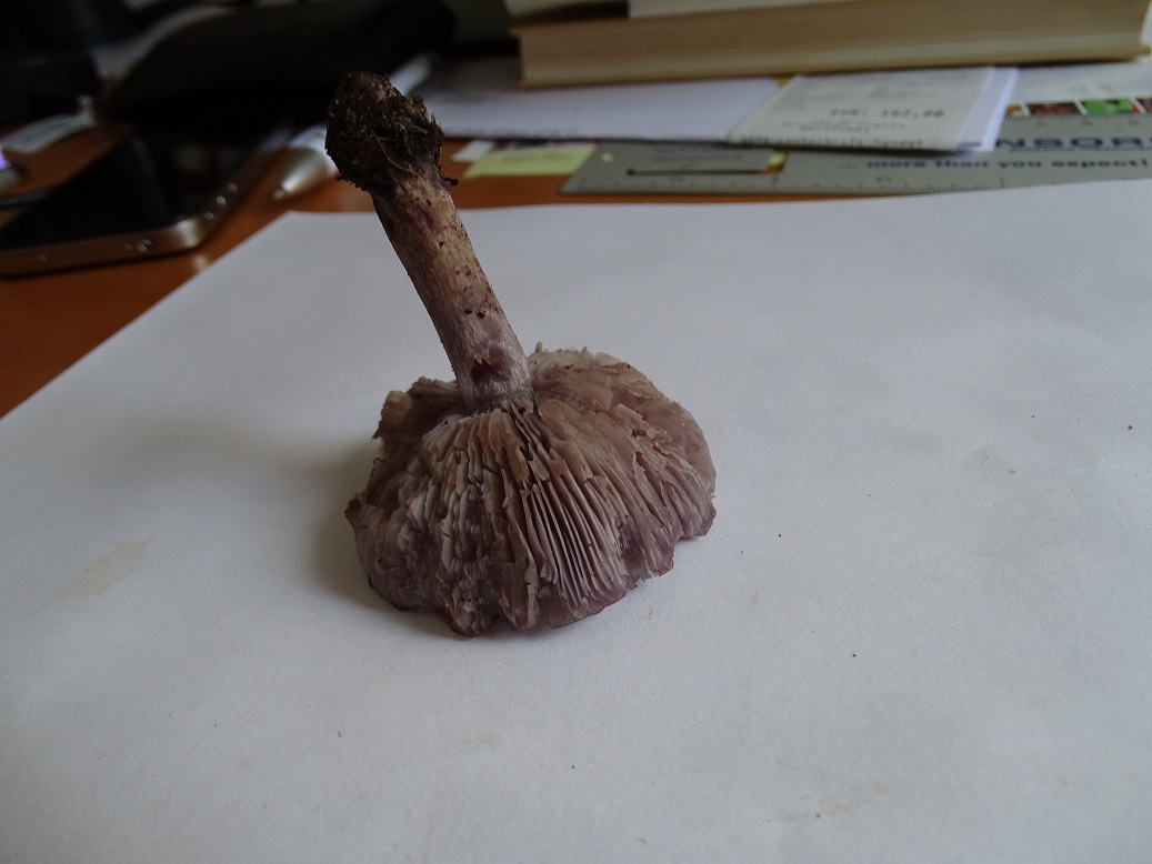 Jetzt zu Hause - siehe die Schreibtischbilder - ist das Lila im wesentlichen einem schmutzigen Violett gewichen, Hutmitte eher bräunlich, der Hut erscheint auch hygrophan, außerdem ist das Pilzchen doch eher schwächlich (Hut knapp 5cm, Stiel 4cm und 0,8cm im Durchmesser).