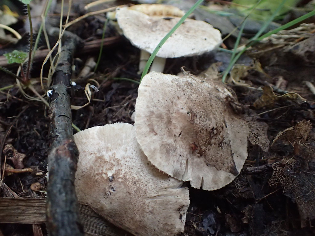 Unter unseren Funden war z.B. auch der Gilbende Erd-Ritterling, Tricholoma argyraceum. Wir hatten allerdings mehrere ähnliche unter den Bestimmlingen liegen und welcher von welcher Fundstelle war das konnte ich später nicht mehr sagen. Manche blieben dabei namenlos.079