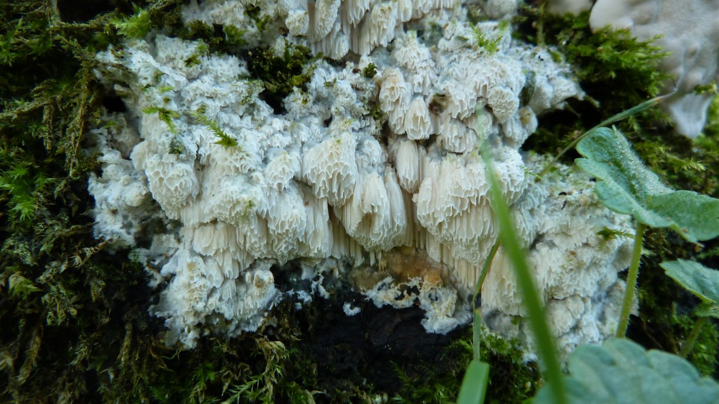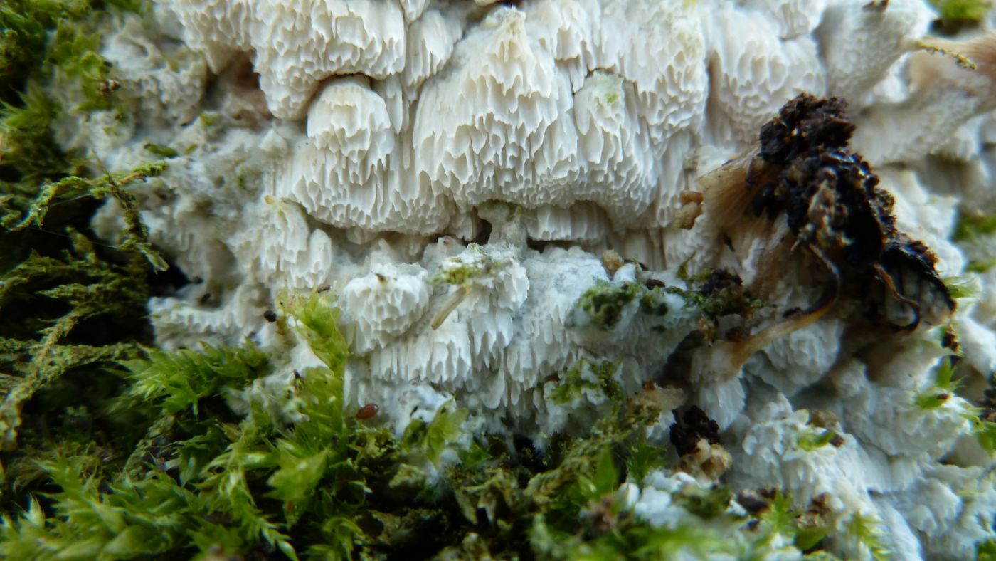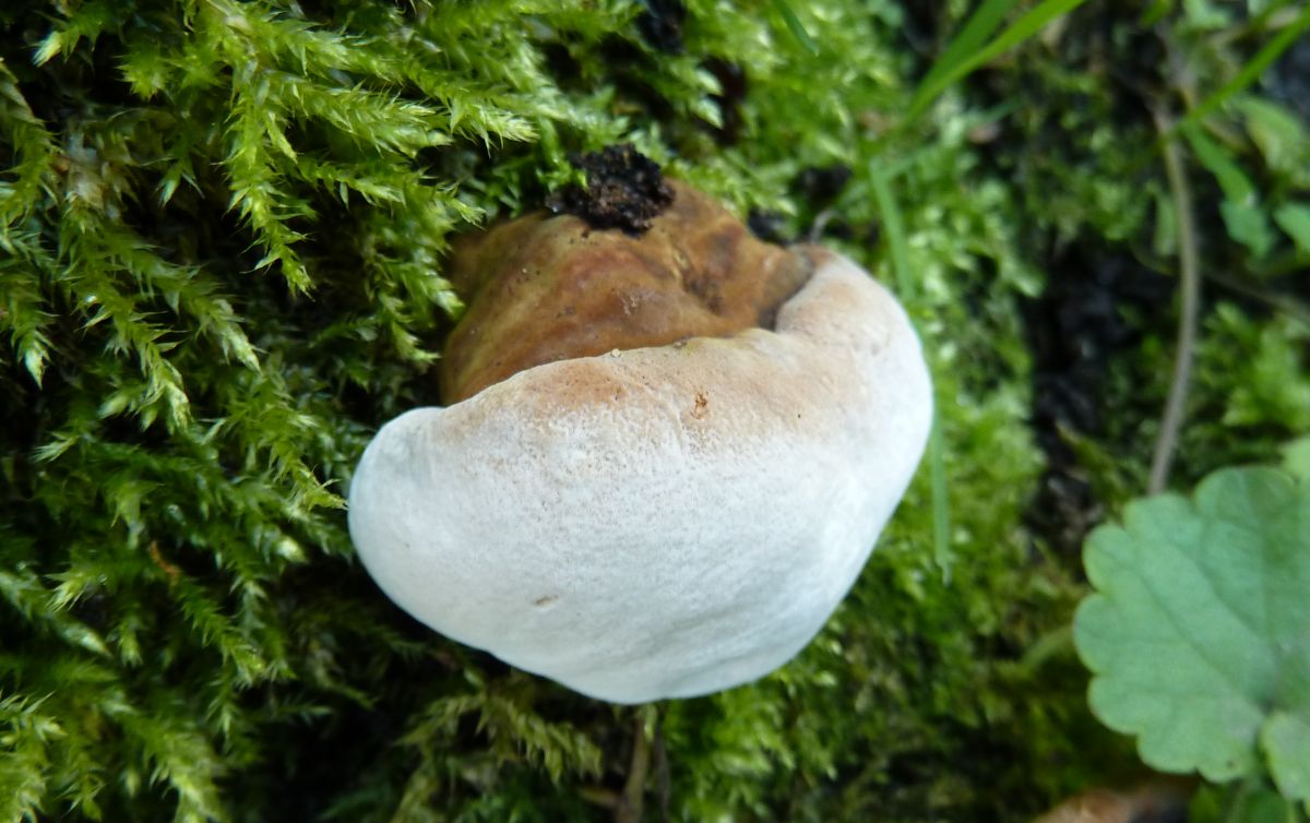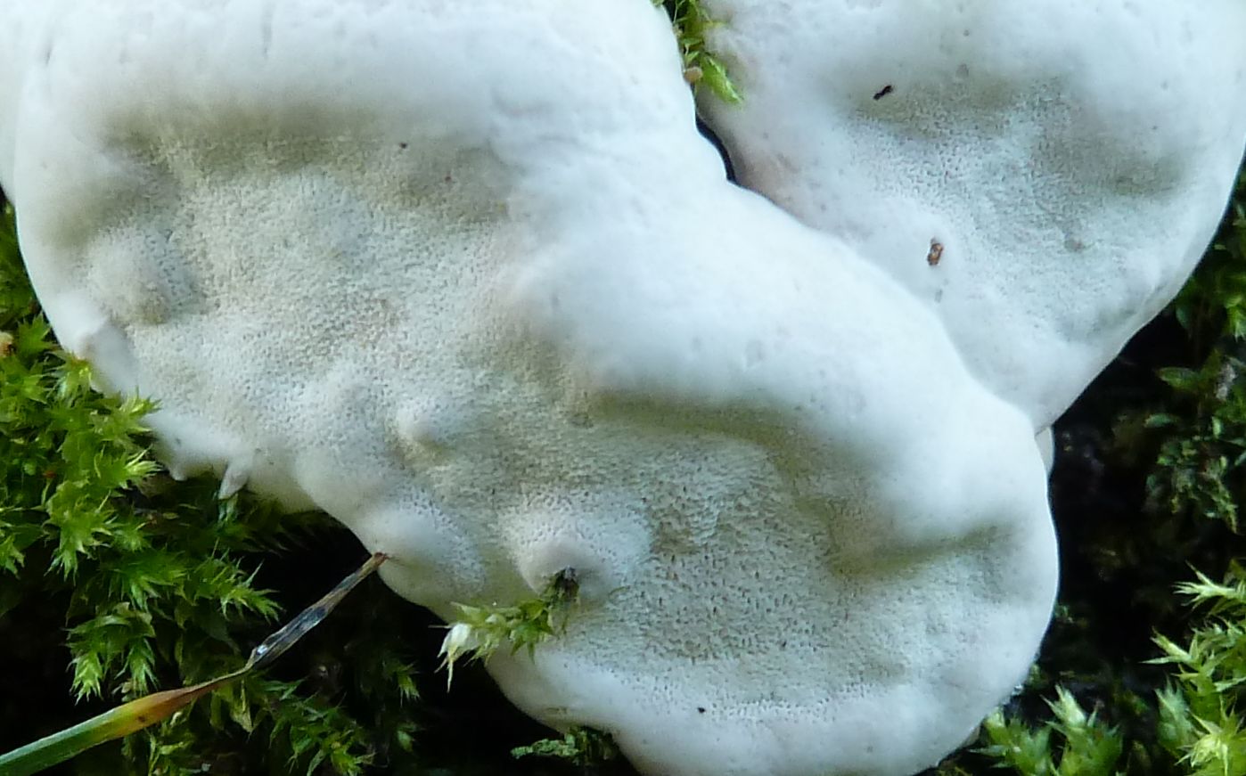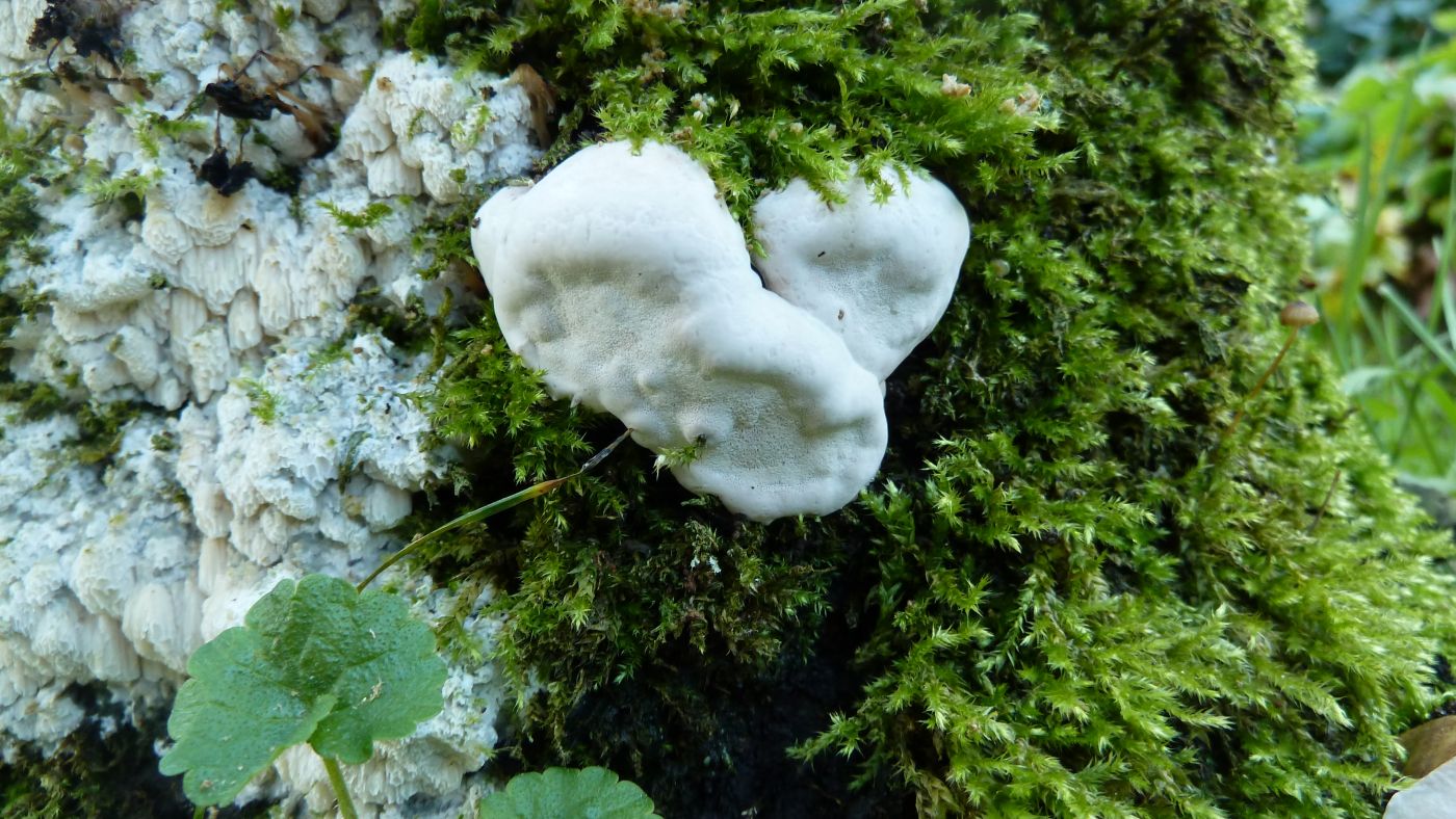 An mehreren Stellen zeigt sich dieser weiße Schwamm oder Porling. Ich glaub, den hatte ich letztes Jahr schon auf einer Wurzel hocken sehen, vielleicht 30cm von Stamm weg. Da war er so unauffällig mit der dunklen Farbe, dass man ihn übersehen kann.