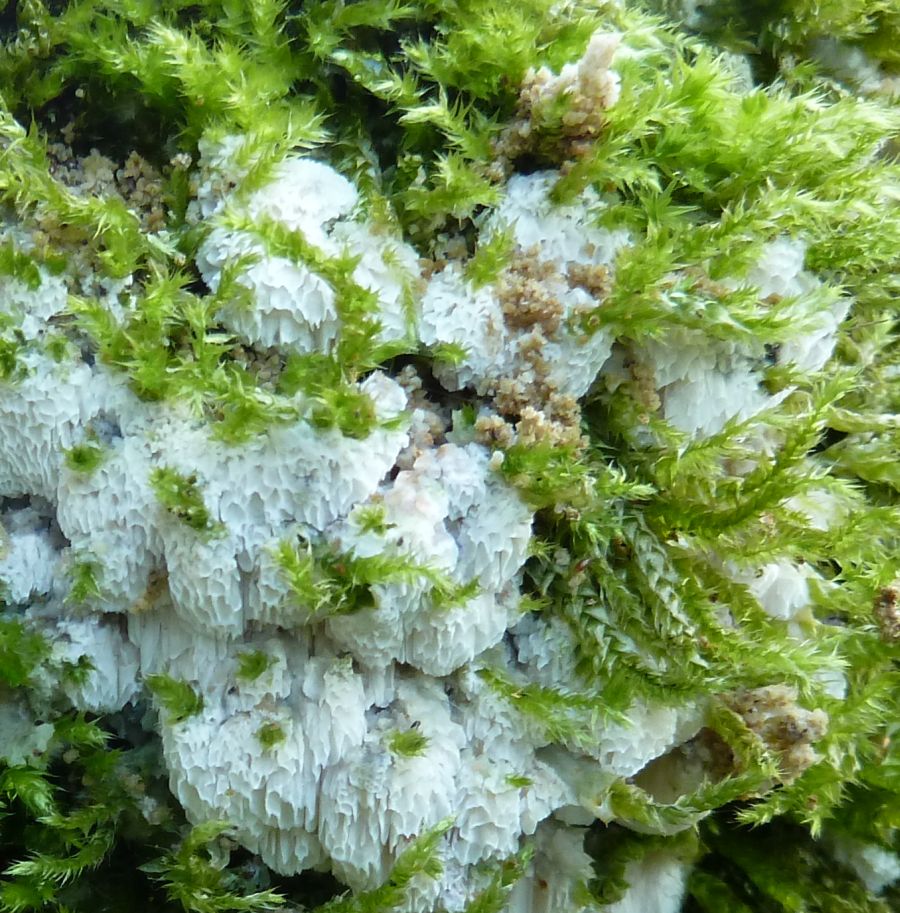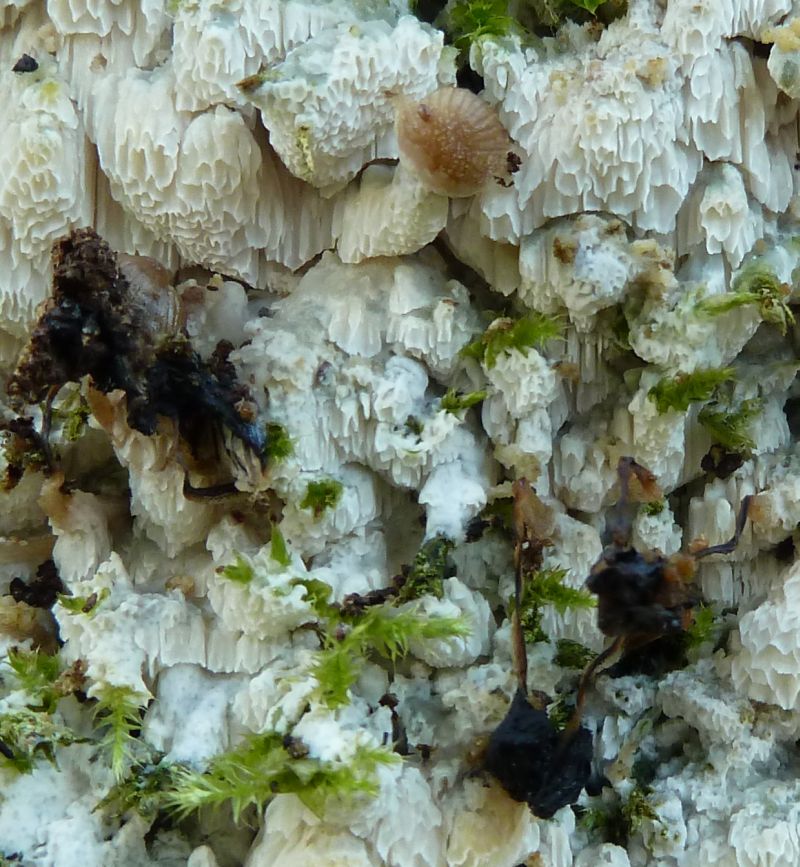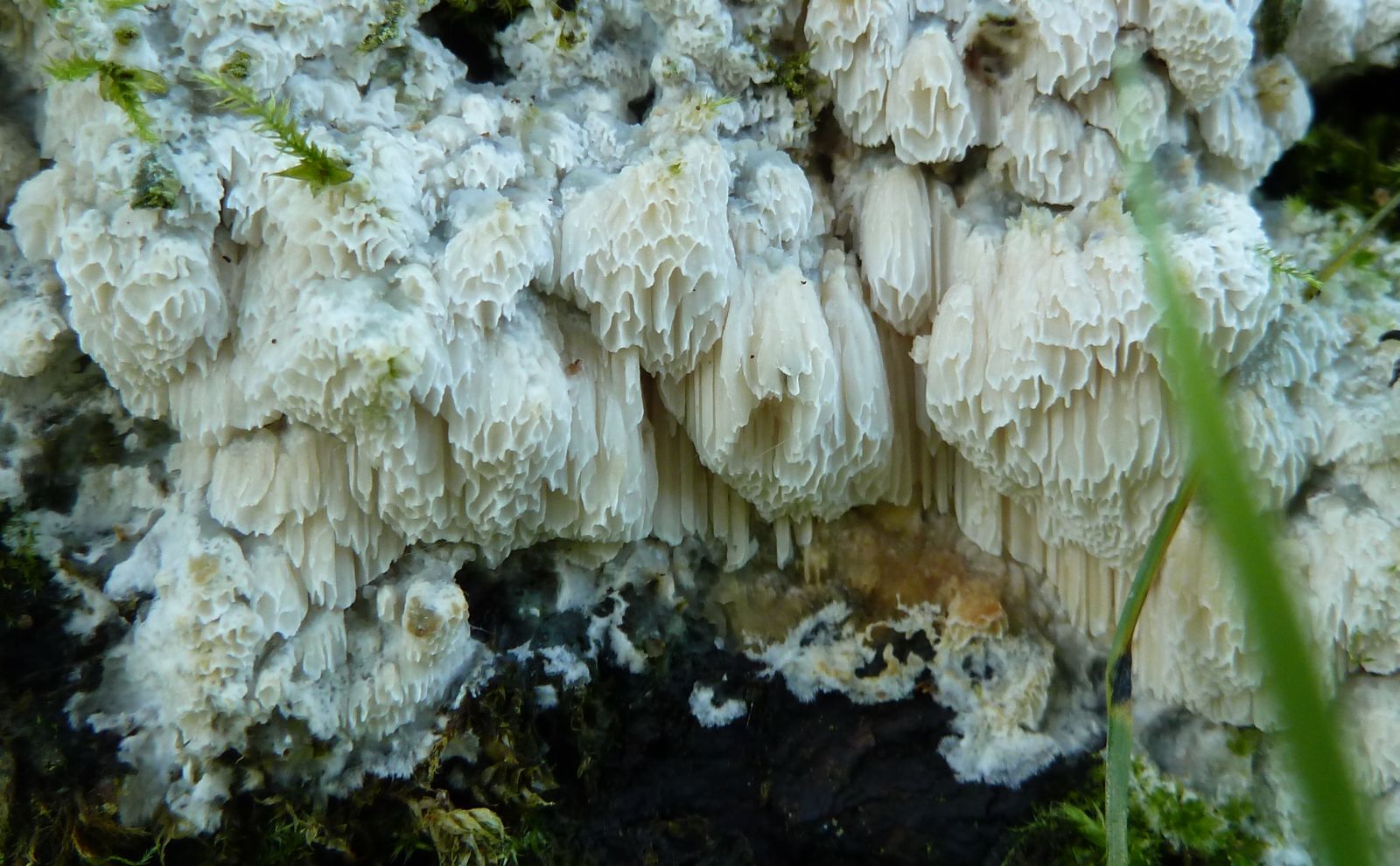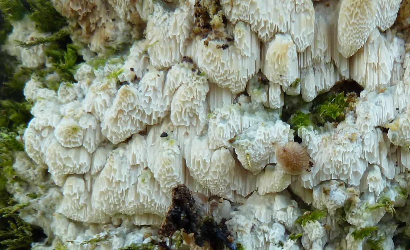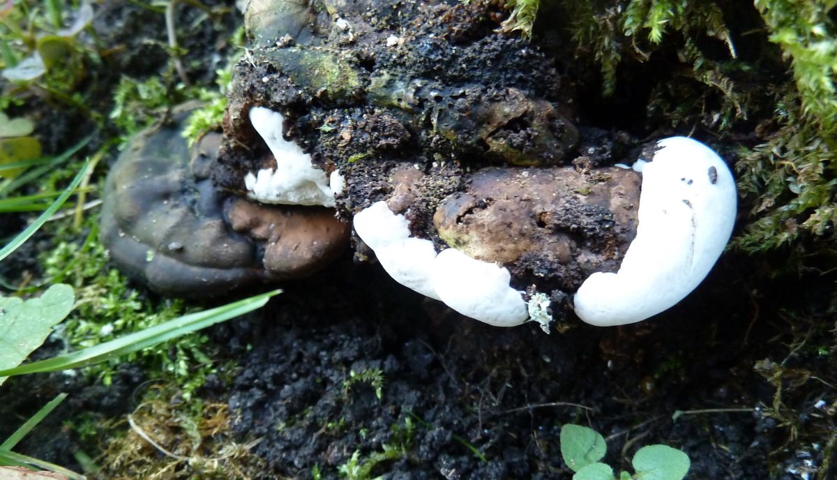 An mehreren Stellen zeigt sich dieser weiße Schwamm oder Porling. Ich glaub, den hatte ich letztes Jahr schon auf einer Wurzel hocken sehen, vielleicht 30cm von Stamm weg. Da war er so unauffällig mit der dunklen Farbe, dass man ihn übersehen kann.