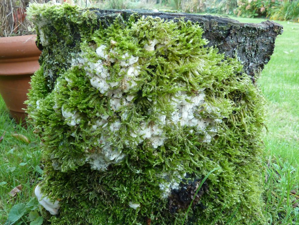 Was immer das ist, es bricht aus dem halben Stumpf buchstäblich aus und quillt durch das Moos. Vielleicht zufällig, aber auch nur da wo das dicke Moos ist. An anderer Stelle sitzen "magere" Flechten, da ist nichts davon...