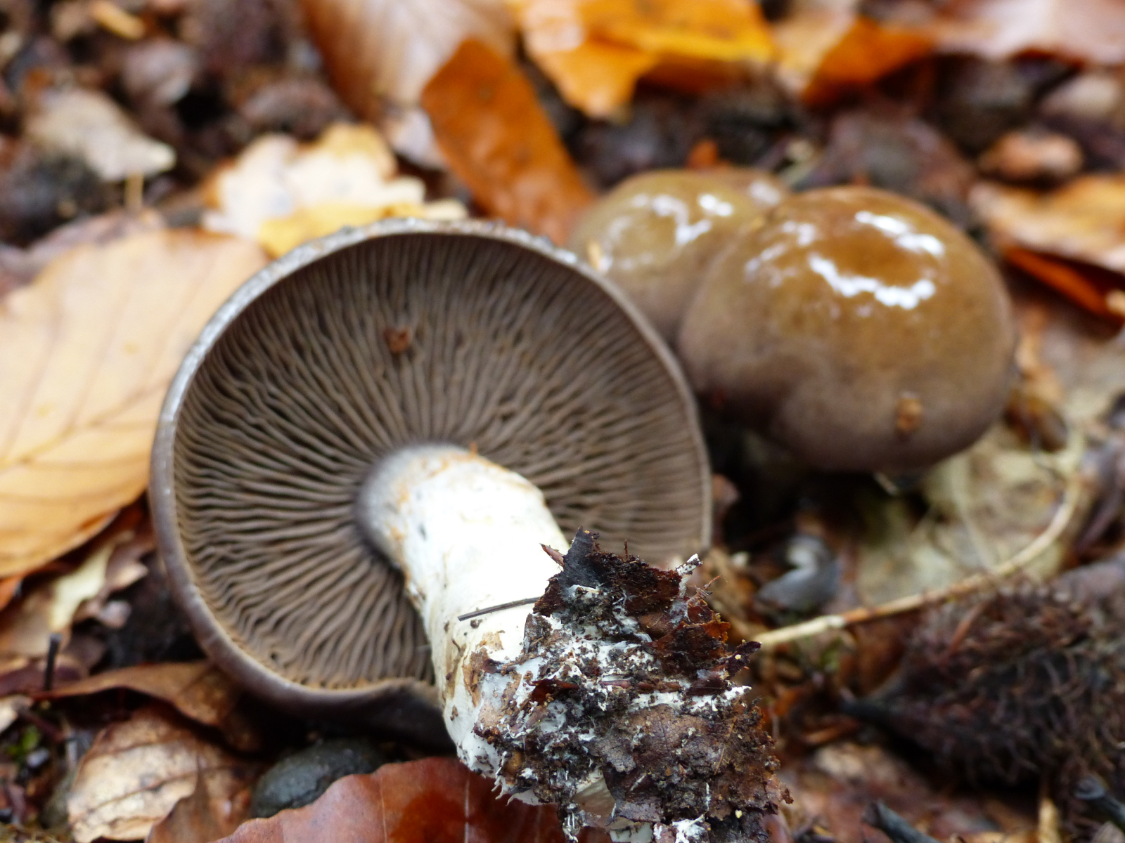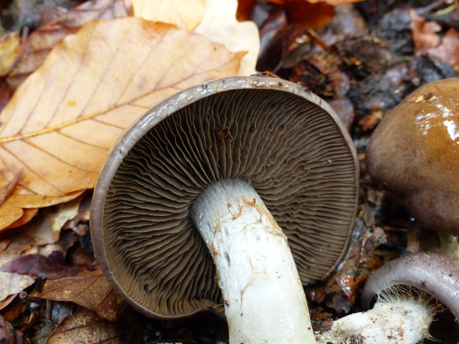 1) Als erstes identifizierst du den Cortinarius über das spinnwebartige Velum, in dem sich idealerweise rostbraunes Sporenpulver verfangen hat (bei älteren Exemplaren eigentlich immer). 2) Dann fallen dir die olivlich grauschwarzen Lamellen bei den jüngeren Exemplaren auf, da bist du dann schon fast sicher in der infractus-Gruppe.