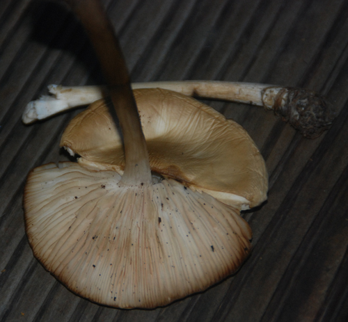 Er hat dichtstehende weisse Lamellen, der Stengel ist verflacht an der Kappenunterseite und laesst sich nicht einfach abtrennen.