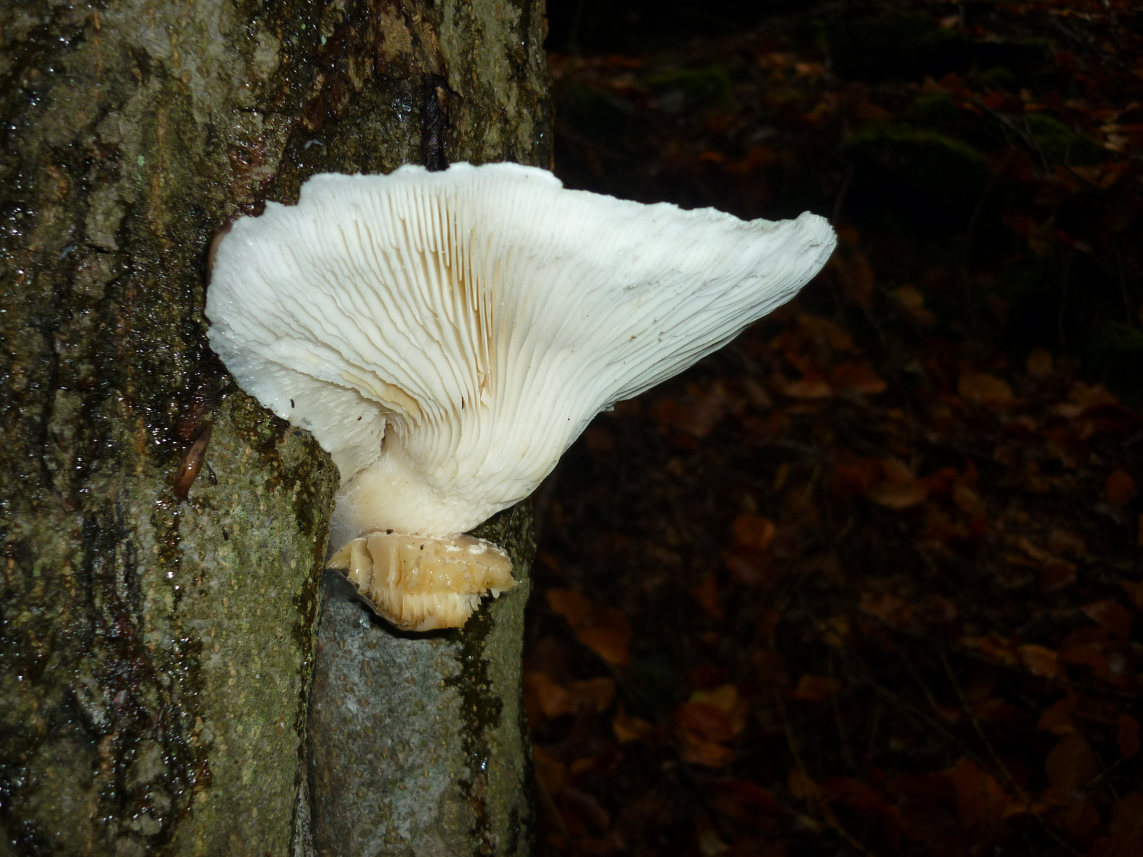 Einer mit cremeweißen Fruchtkörpern und einem Stiel der ein Stück hinunter gerippt ist, aber nicht vollständig, an Buche, angenehmer Geruch, auch am nächsten Tag cremeweiß bleibend, Fruchtkörper mittlerweile 15 cm Durchmesser.