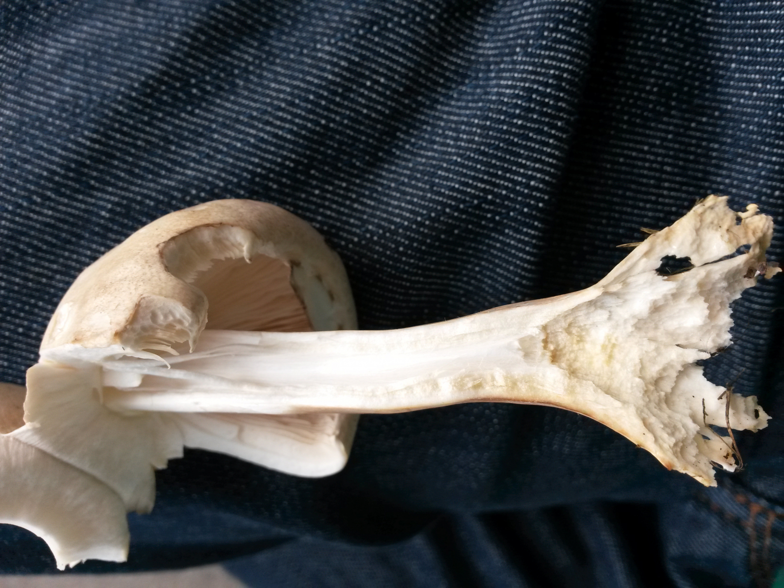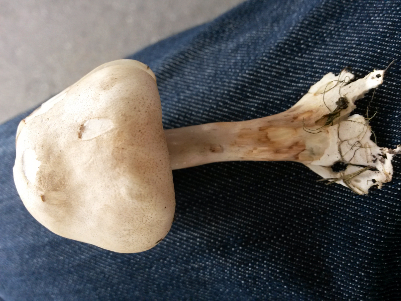 ich habe heute einen frisch herausgerissenen Pilz auf dem Weg zum Bäcker auf einem kleinen Wieschen neben der Straße gefunden.